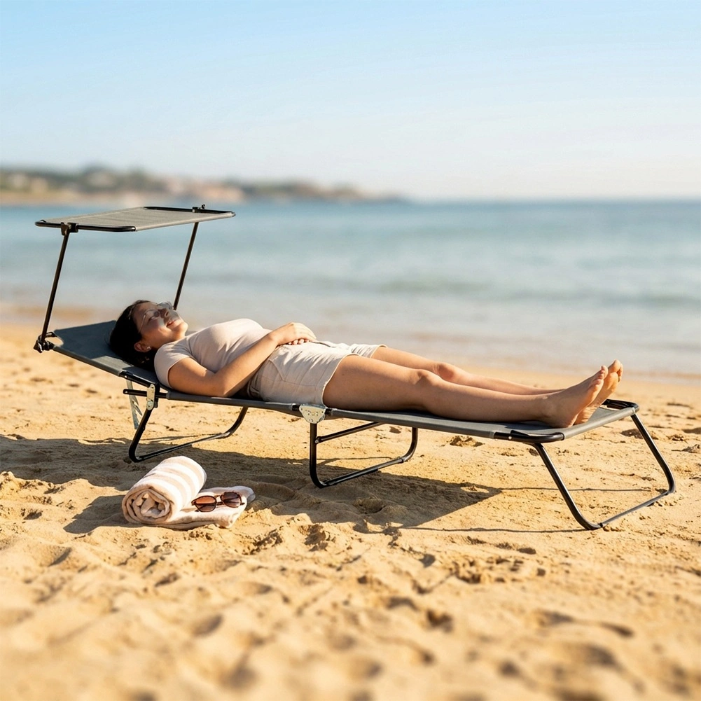 Integrovaná stříška chrání před přímým sluncem a lze ji plynule nastavit podle úhlu záření pro maximální pohodlí při čtení i odpočinku.