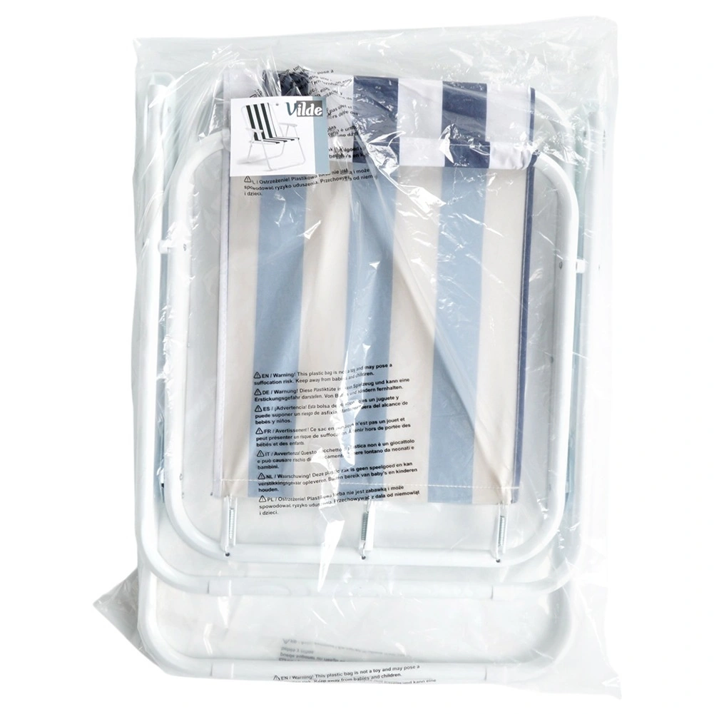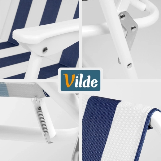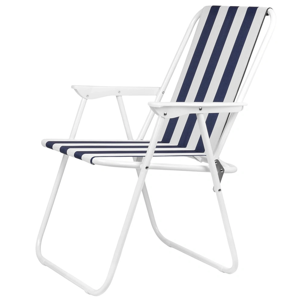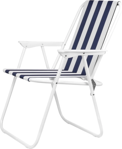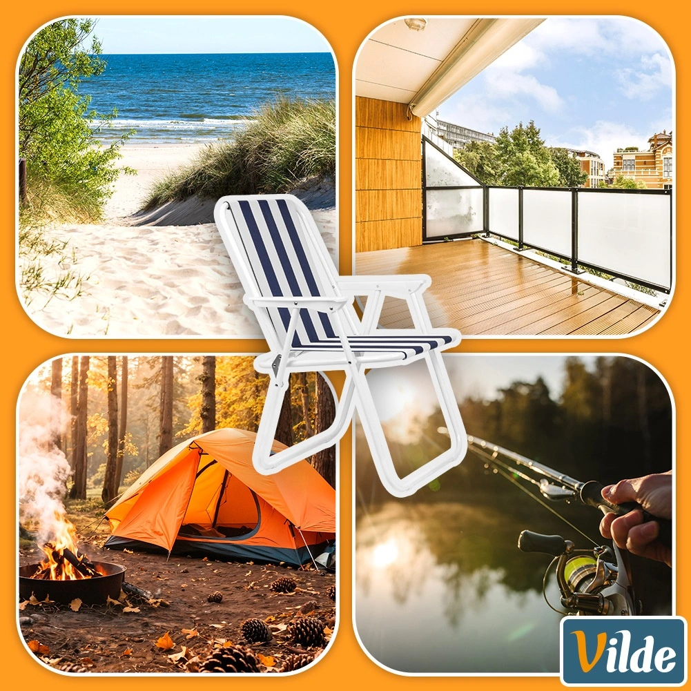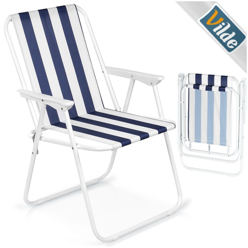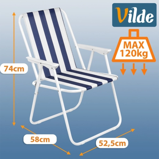 Tato skládací turistická židle Vilde spojuje odolnost a komfort v elegantním provedení s modro‑bílými pruhy. Stabilní kovový rám v bílé barvě a pevná polyesterová textilie poskytují spolehlivou oporu doma i na cestách. Díky nízké hmotnosti a rychlému skládání ji snadno vezmete na pláž, ryby, piknik i kemp.