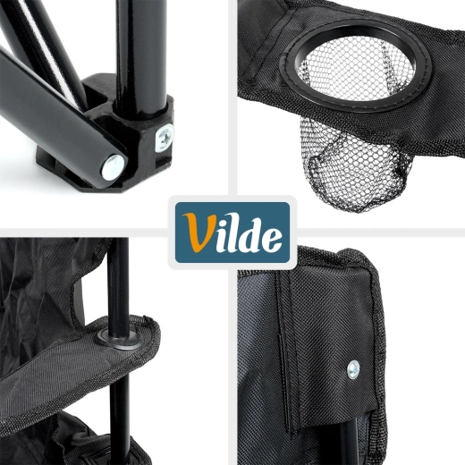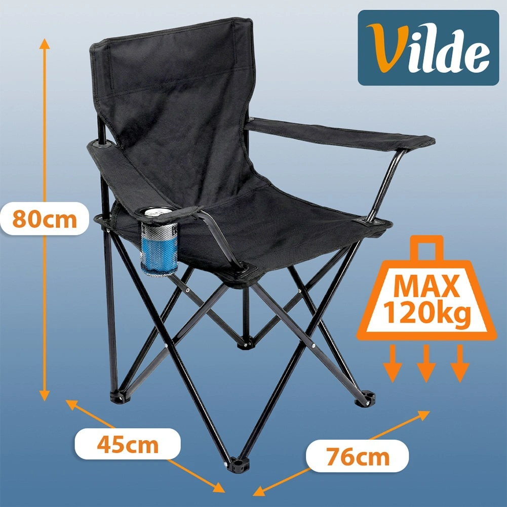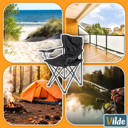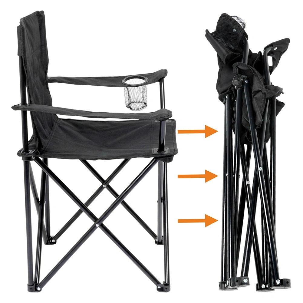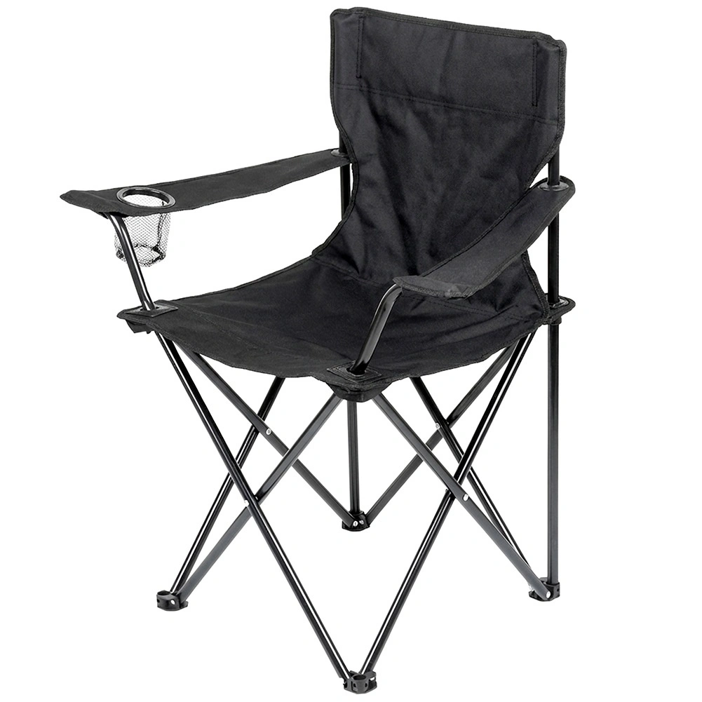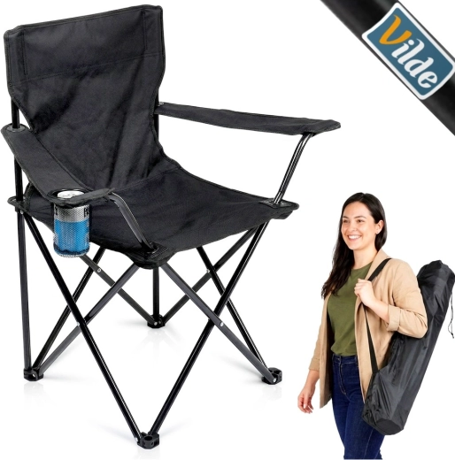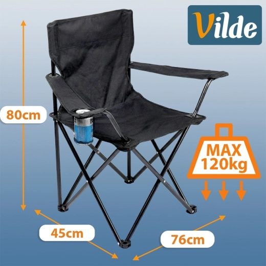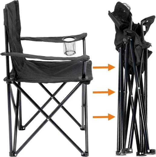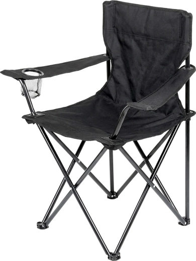 Lehká a skladná kempingová židle s pevnou kovovou konstrukcí a odolným polyesterovým potahem v černé barvě. Snadno se skládá, vejde se do přepravního obalu s popruhem a nabízí područky s držákem nápoje. Ideální na kempování, rybaření, pláž i zahradu, s nosností až 120 kg a odolností vůči povětrnostním vlivům.