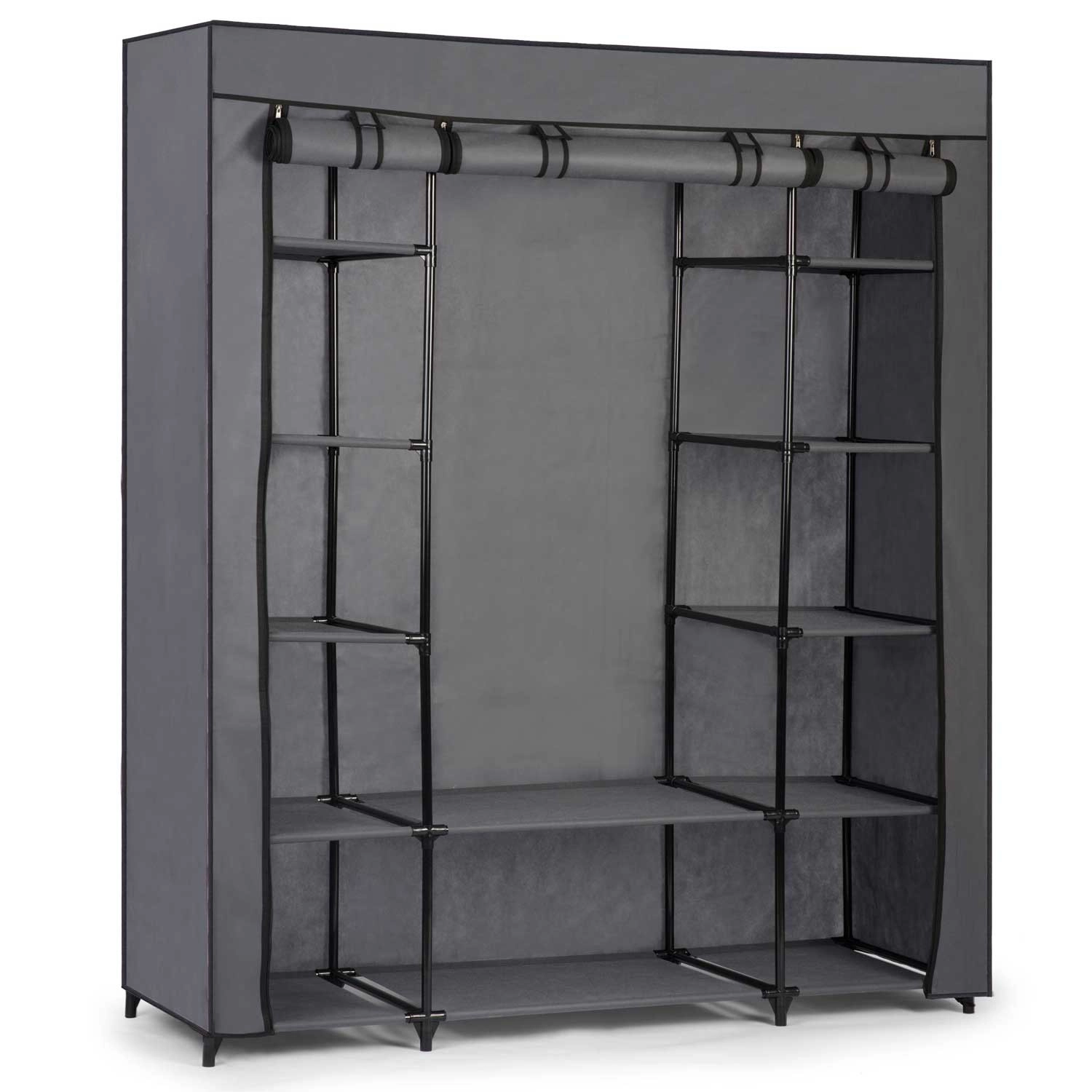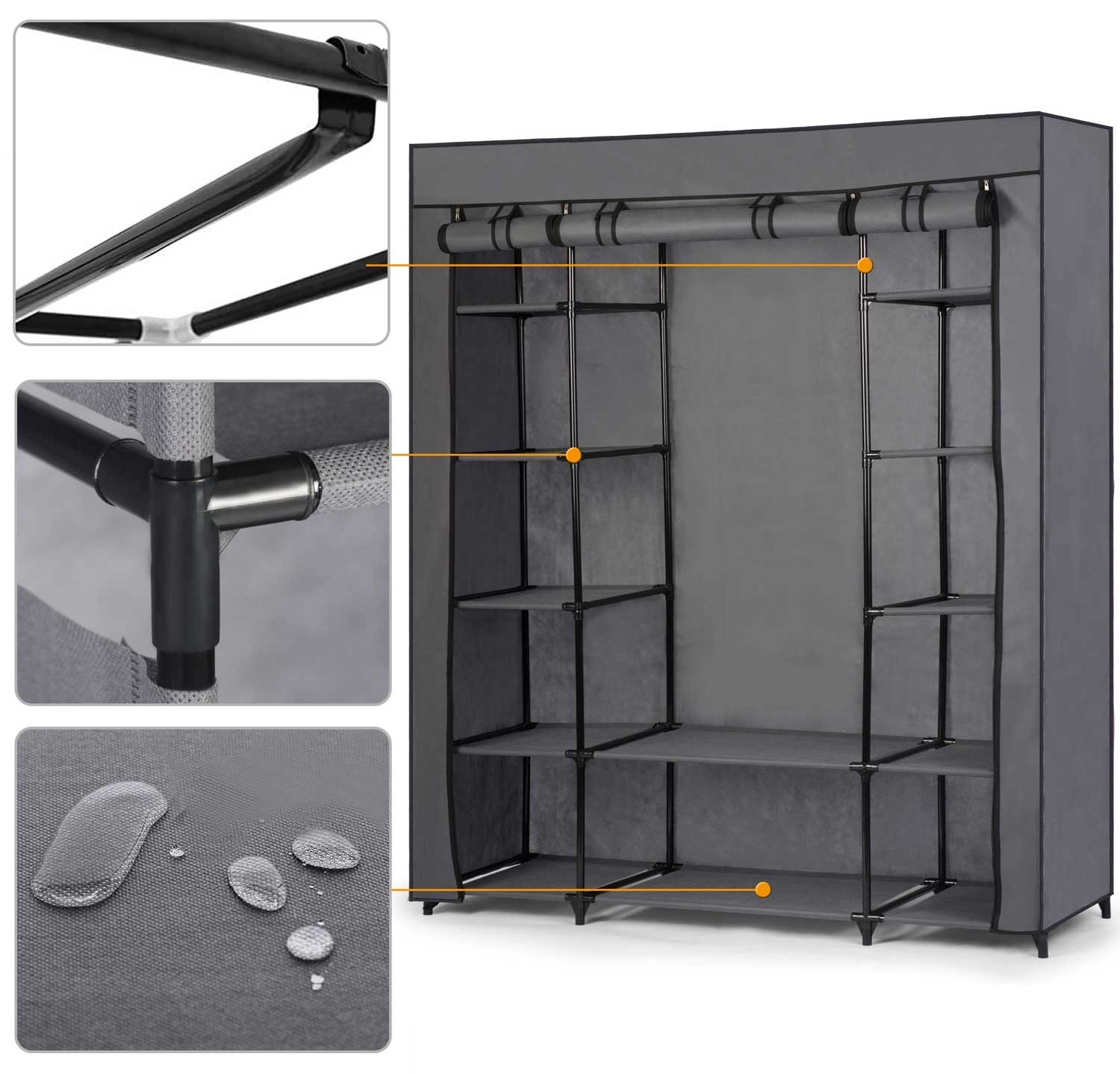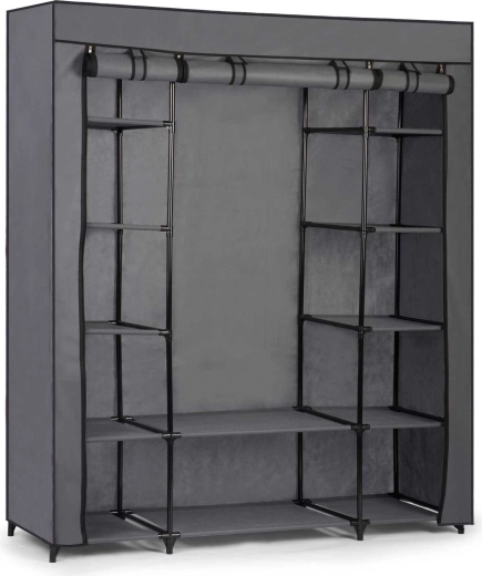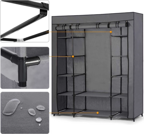 Textilní skříň Massido – grafitová je skvělou volbou, pokud potřebujete rychle a efektivně rozšířit úložný prostor. Díky kombinaci ocelového stelaže a pevných PP spojek je konstrukce stabilní a dlouhodobě odolná. Voděodolný potah chrání oblečení před prachem a vlhkostí, zatímco promyšlené členění na tři oddělené zóny vám umožní snadno třídit a organizovat vše od triček po kabáty.