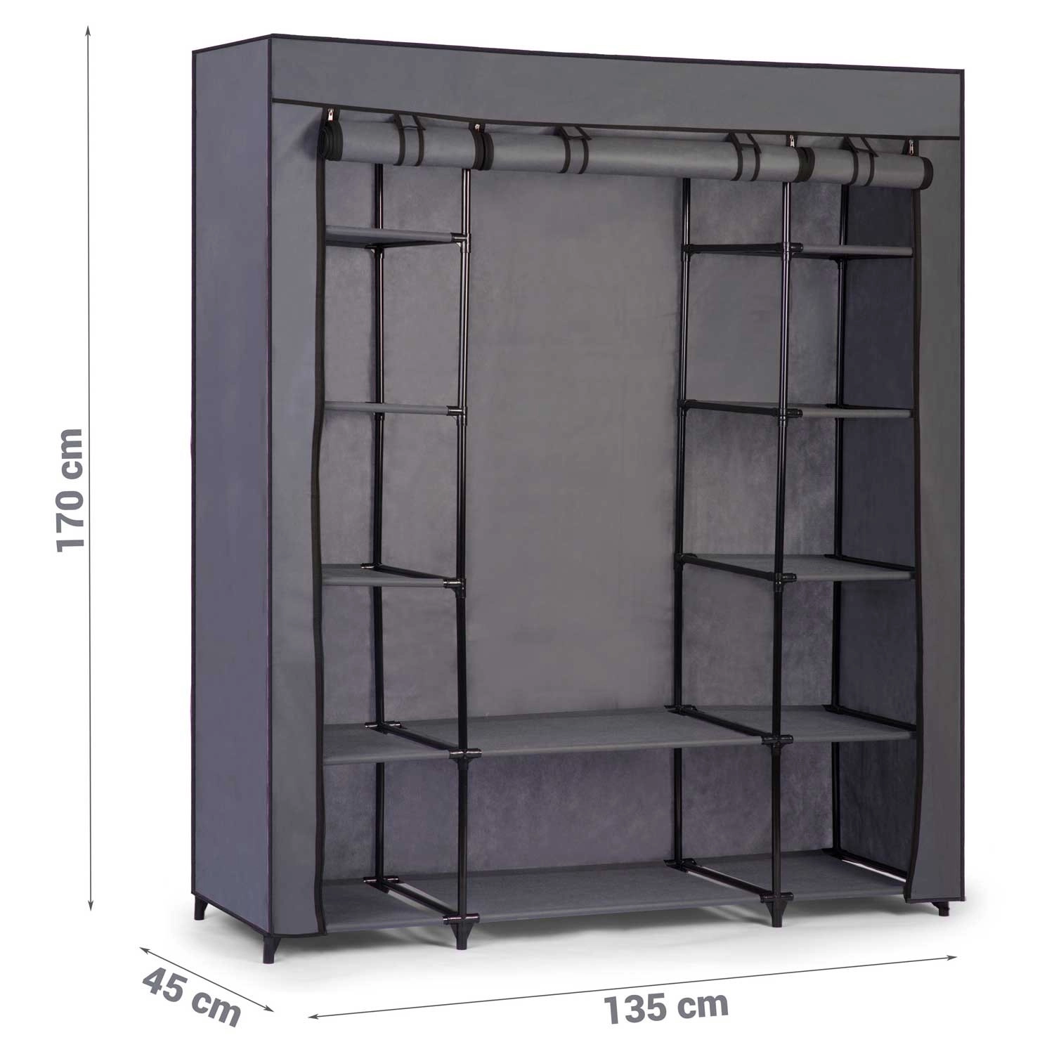 Praktická a prostorná textilní skříň Massido v grafitové barvě nabízí 12 pevných polic, drážek na ramínka a ocelový rám pro vysokou stabilitu. Tři samostatné sekce s vlastními dveřmi a čtyřmi zipy zaručují pohodlný přístup a přehledné uložení. Odolný, voděodolný materiál a snadná, intuitivní montáž dělají z této skříně ideální řešení do ložnice, šatny i předsíně.
