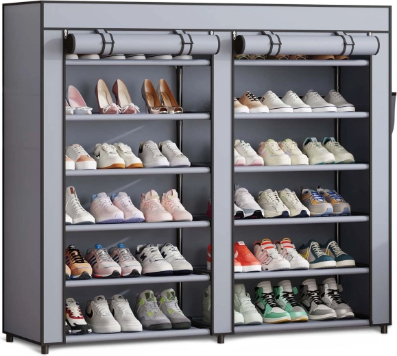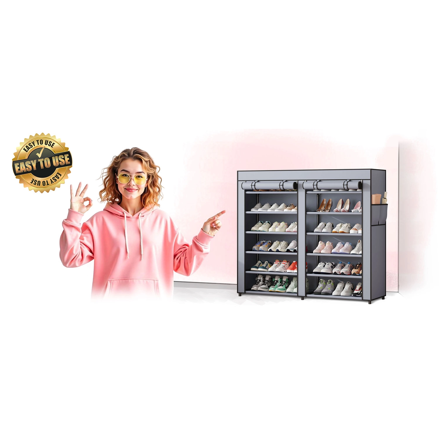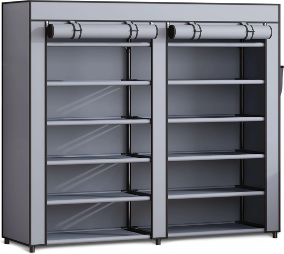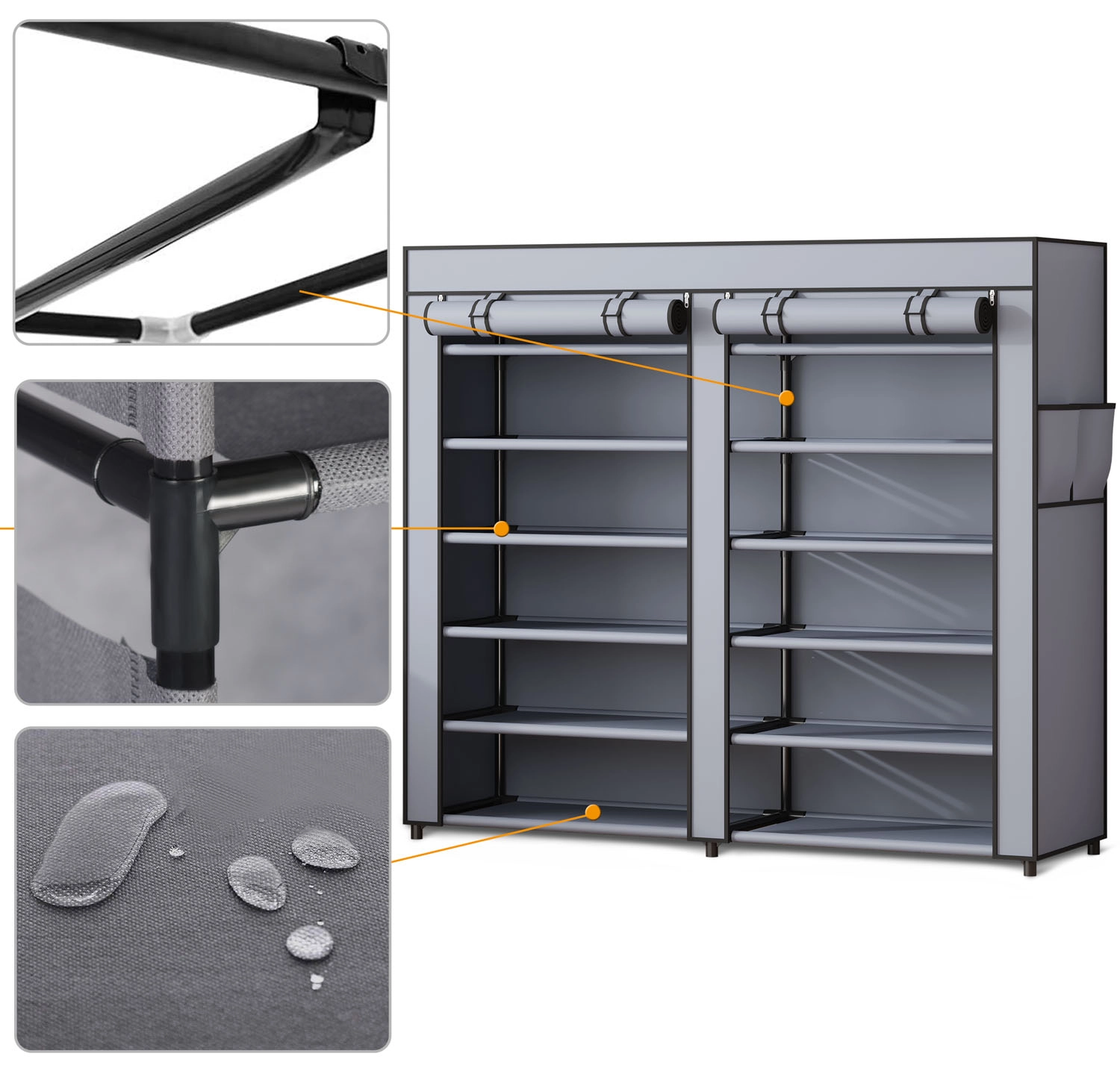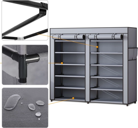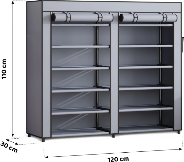 Praktická textilní skříň na boty Massido v elegantní grafitové barvě nabízí až 12 pevných polic, stabilní ocelovou konstrukci a zapínání na zip pro čistý a přehledný vstup. Díky voděodolnému potahu a snadné, intuitivní montáži je ideální do předsíně, šatny i menších bytů.