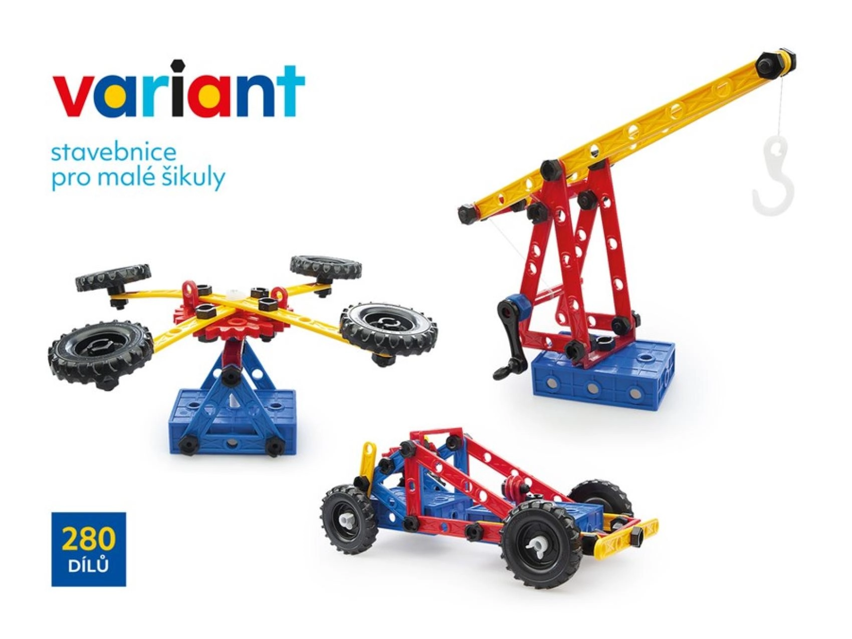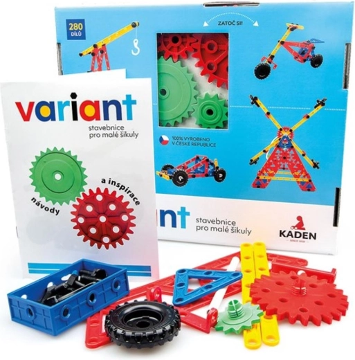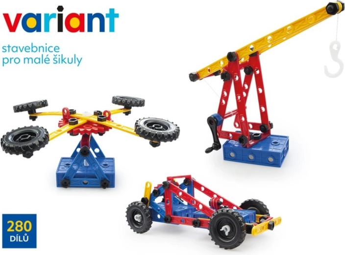 Objevte kreativní svět s plastovou stavebnicí Variant o 280 dílech, která rozvíjí jemnou motoriku, prostorovou představivost i logické myšlení. Díky pevným šroubkům a matičkám, velkým děrovaným panelům a ozubeným kolům s řetězem děti postaví auta, letadla i lodě – a to znovu a znovu.