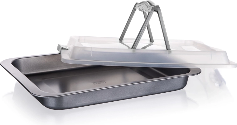 Užijte si rovnoměrné pečení a pohodlnou manipulaci s univerzálním plechem z uhlíkové oceli. Díky nepřilnavému povrchu XYNFLON (PTFE) snadno vyklopíte koláče, maso i zeleninu bez připalování a s minimem tuku. Plastové víko oceníte při skladování v lednici i při přenášení na piknik nebo návštěvu.
