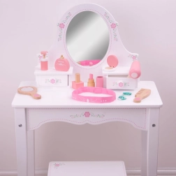 Roztomilá 11dílná dřevěná sada pro hru na salon krásy v praktickém přenosném kufříku potěší všechny malé parádnice od 3 let. Děti si užijí napodobování dospělých s doplňky jako zrcátko, hřeben, fén, rtěnka či lak na nehty – a zároveň rozvíjejí kreativitu a jemnou motoriku i sociální a jazykové dovednosti. Vyrobeno z kvalitních a bezpečných materiálů, odpovídá evropským normám.