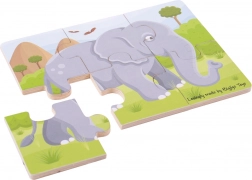 Sada obsahuje 3 skládačky s motivy lva, zebry a slona – ideální pro postupné učení i pestřejší hru.