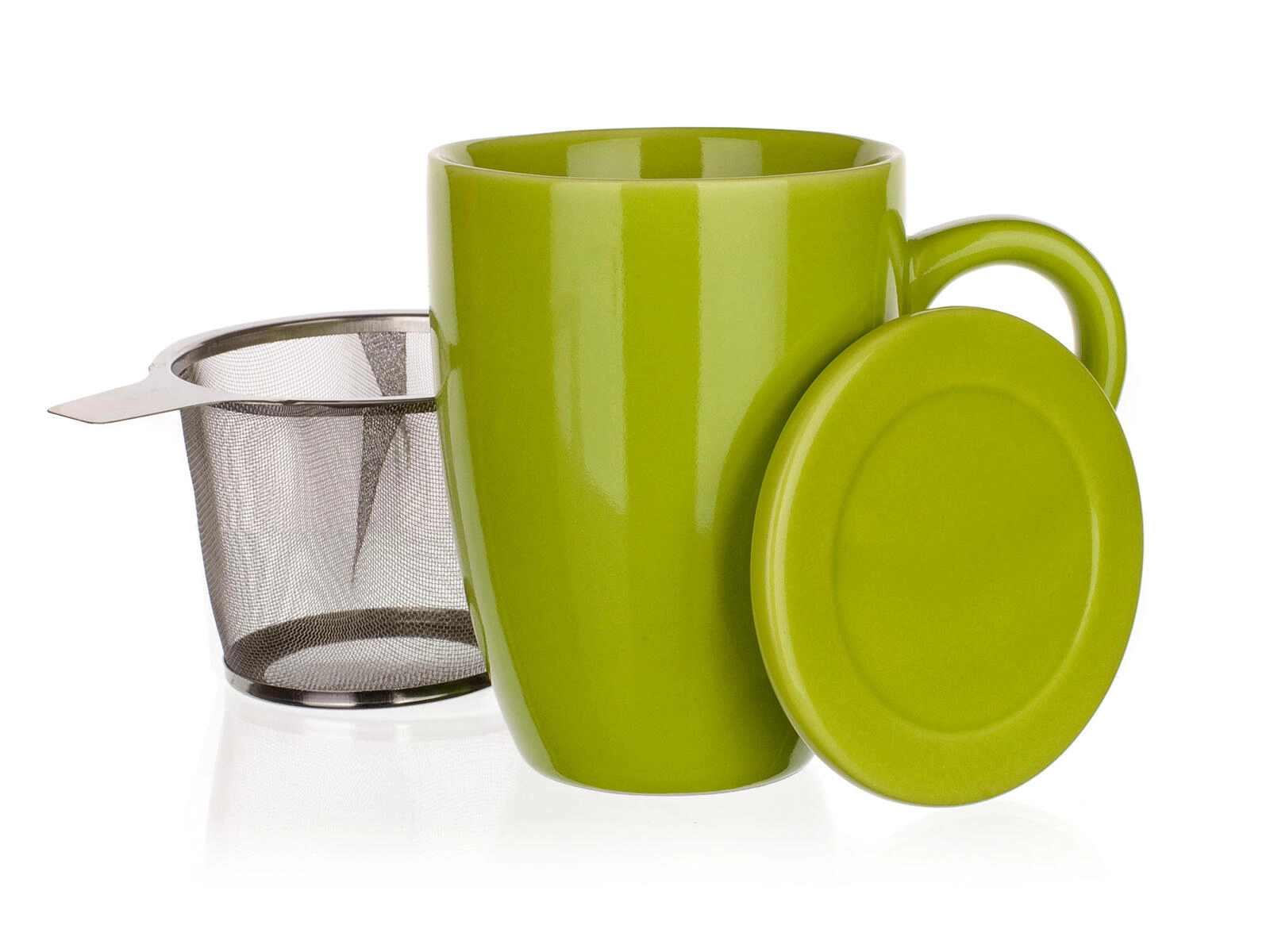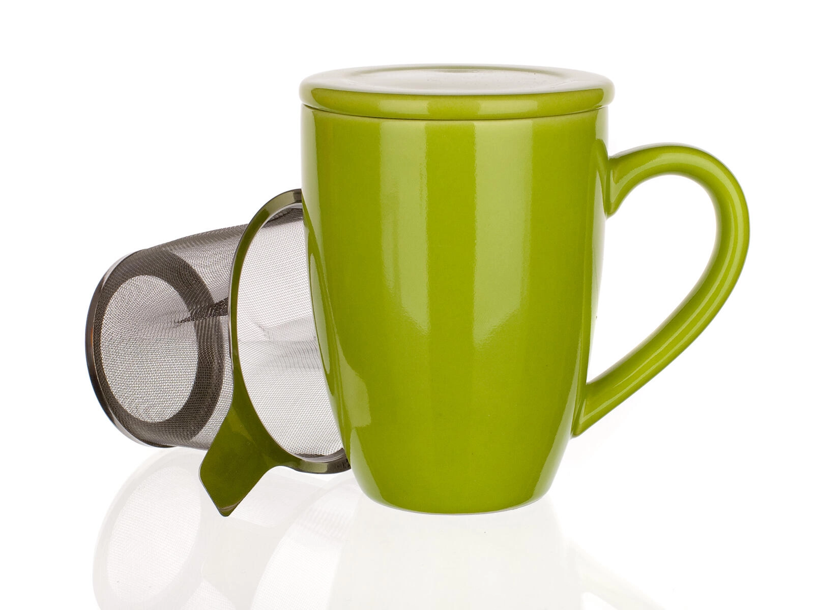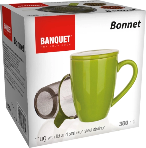 Stylový zelený hrnek BONNET o objemu 350 ml s víčkem a integrovaným nerezovým sítkem je ideální pro milovníky sypaného čaje. Nabízí praktické louhování přímo v hrnku, udržení teploty díky víčku a snadnou údržbu – je vhodný do myčky nádobí i mikrovlnné trouby.