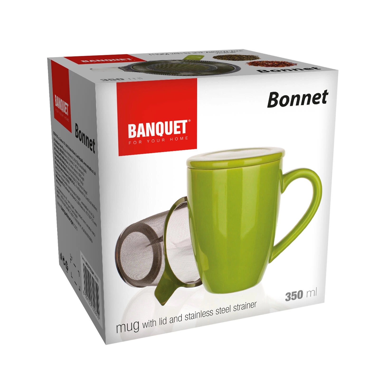 Užijte si pohodlnou přípravu sypaného čaje s hrnkem BONNET. Kvalitní keramika s lesklou zelenou glazurou příjemně padne do ruky, víčko pomáhá udržet nápoj déle teplý a po louhování poslouží jako praktická odkládací miska pro sítko.