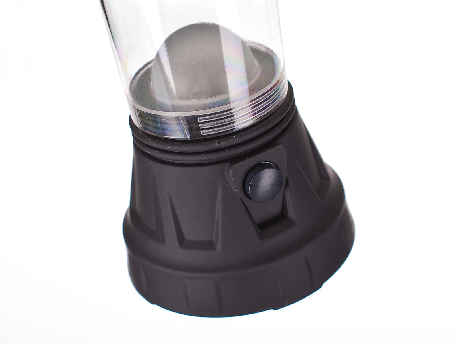 Průhledný válcový difuzor a horní držadlo umožňují rovnoměrné nasvícení prostoru i pohodlné zavěšení ve stanu či na větvi.