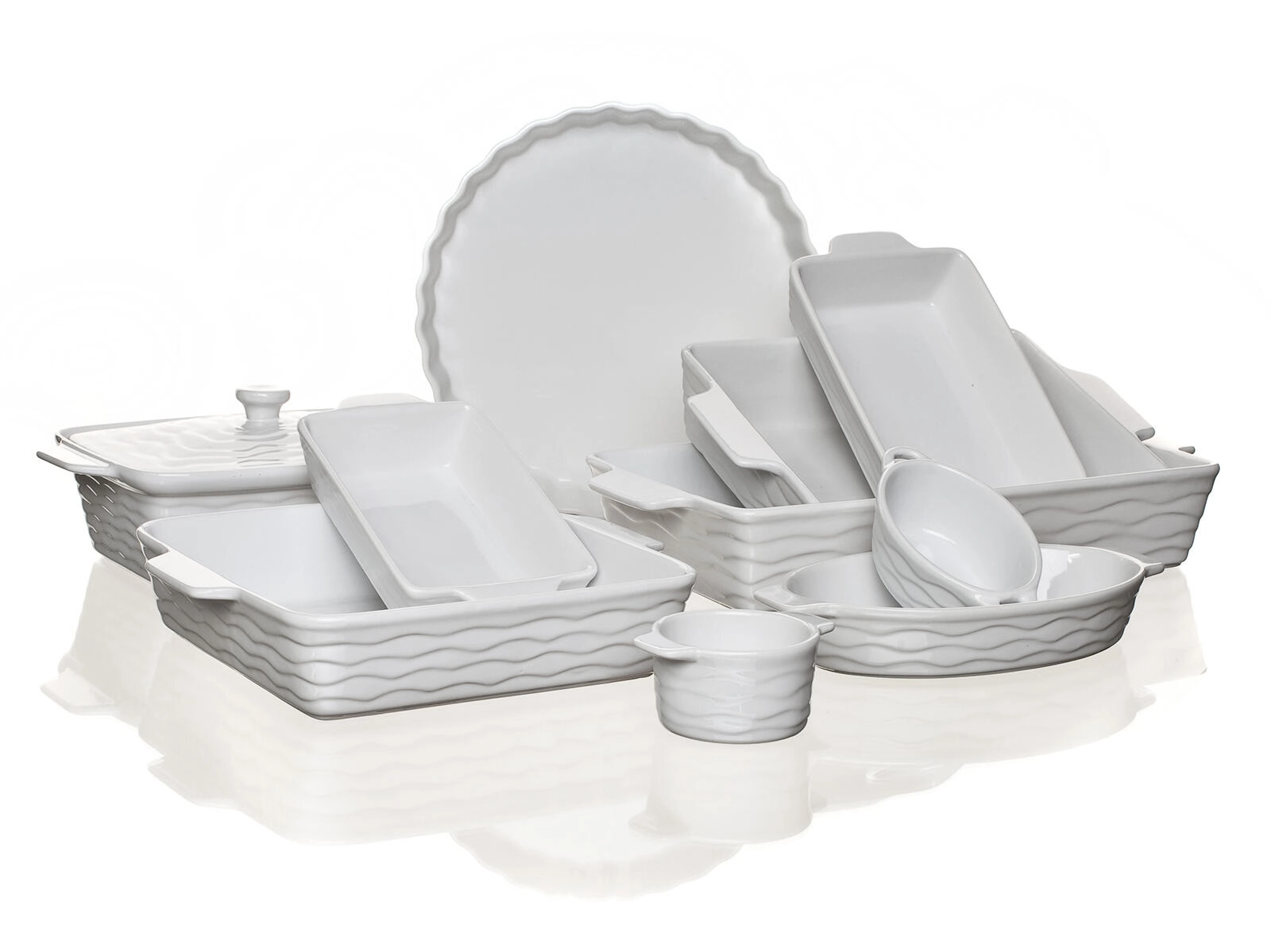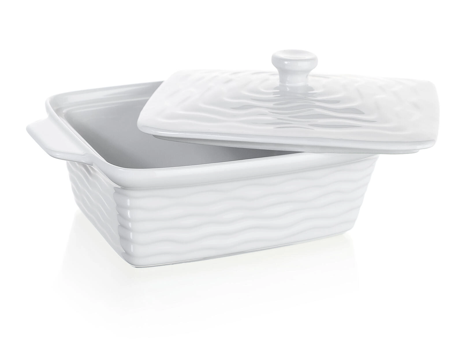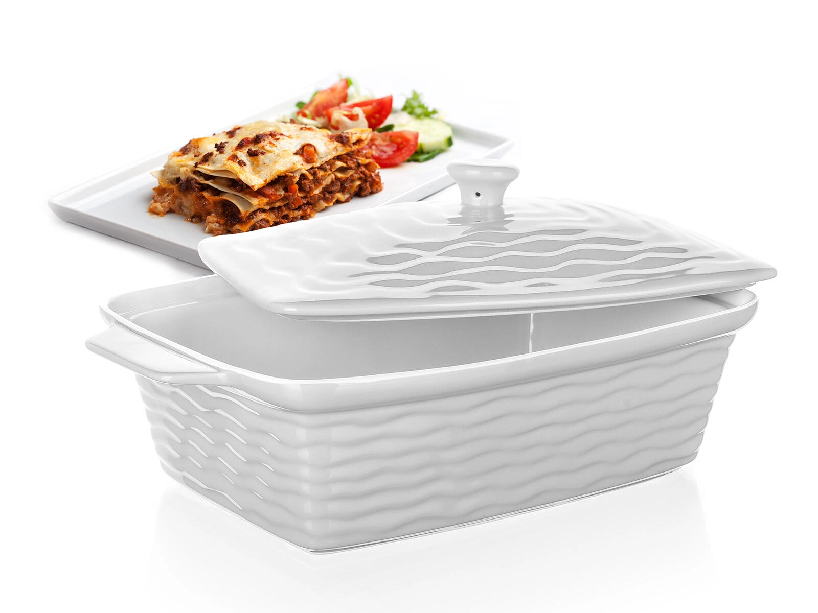 Keramika rovnoměrně absorbuje a uvolňuje teplo, proto dosáhnete perfektně propečených a šťavnatých výsledků. Dekorativní vlnkový reliéf z ní navíc dělá elegantní nádobu i pro přímé servírování na stůl.