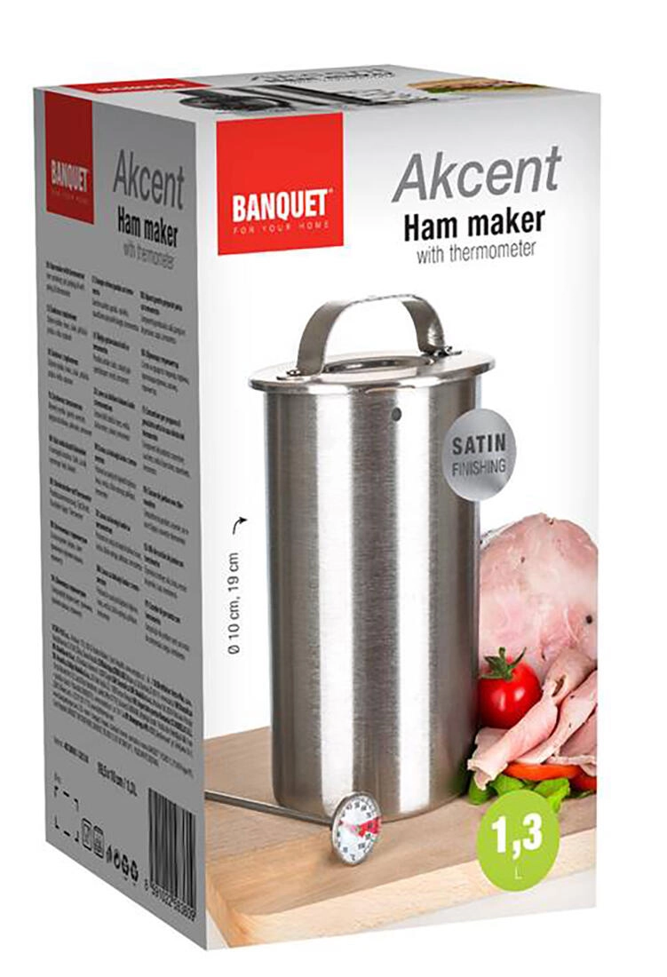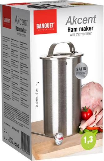 Připravte si doma poctivou šunku bez konzervantů a chemických příměsí. Tento šunkovar z kvalitní nerezové oceli 18/10 s objemem 1,3 l a integrovaným teploměrem umožní snadnou přípravu cca 1 kg masa. Díky pružině a přítlačnému talíři je maso dokonale stlačeno, což zajistí kompaktní tvar a šťavnatou strukturu. Odolná nerez 18/10, kontrola teploty teploměrem, snadné rozložení a čištění, vhodné do myčky.