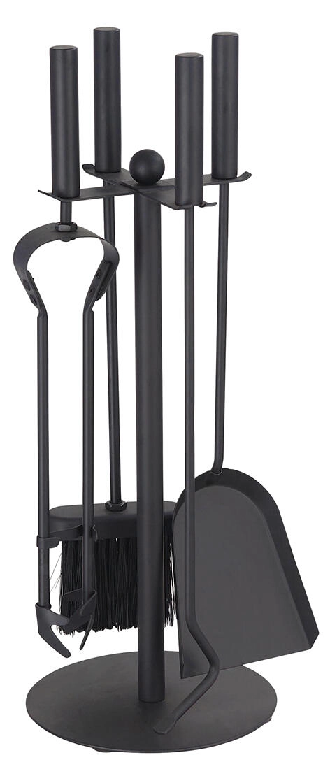 Elegantní a praktická 4dílná sada krbového nářadí z černé oceli se stabilním stojanem a výškou 49 cm zajistí pohodlnou obsluhu krbu i čistý vzhled okolí. Součástí je lopatka, pohrabáč, kleště a košťátko – vše v jednotném, odolném provedení.