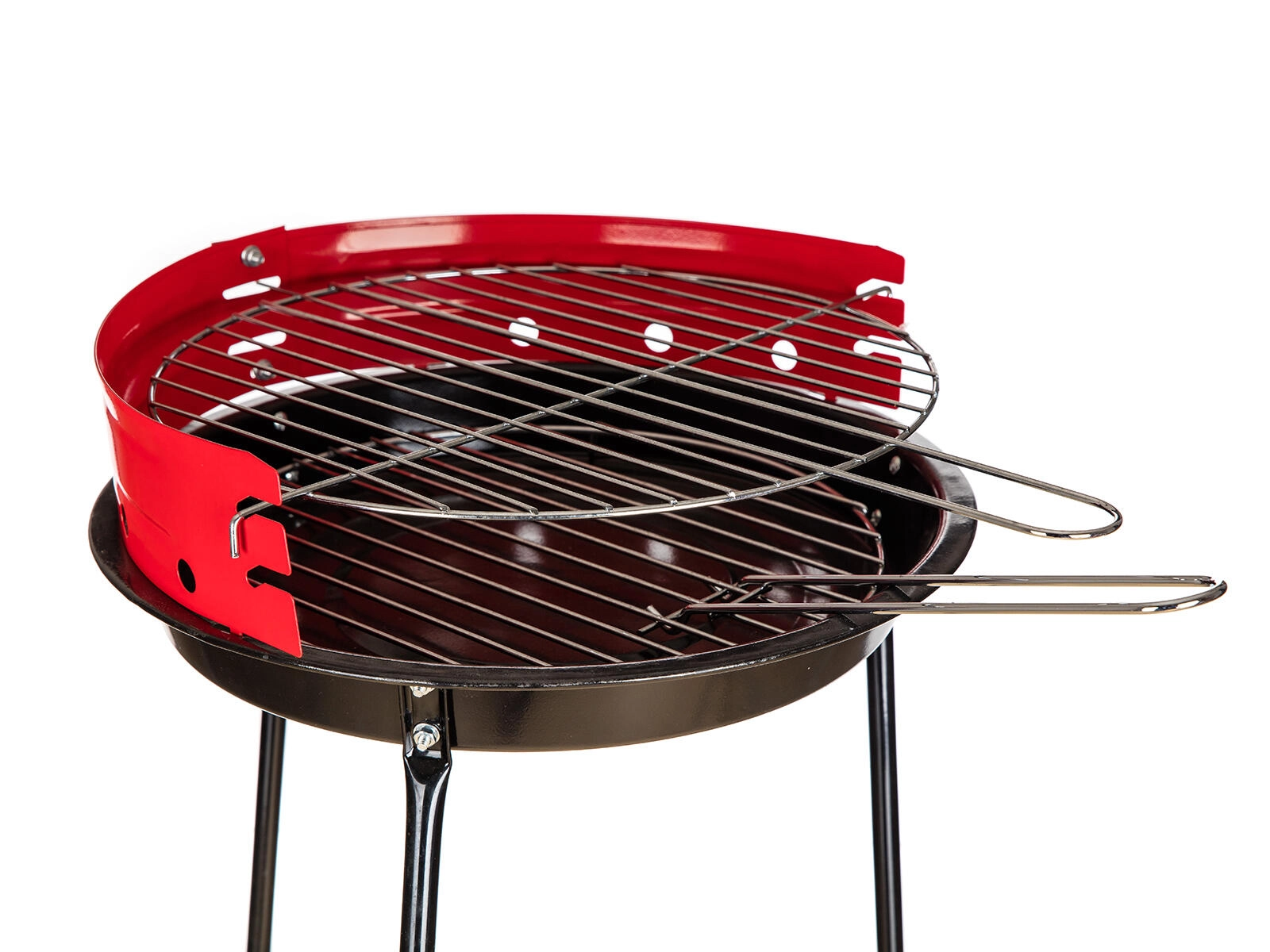 Dva chromované rošty a červená větrná zástěna pomáhají s rovnoměrným grilováním a ochranou před poryvy větru.