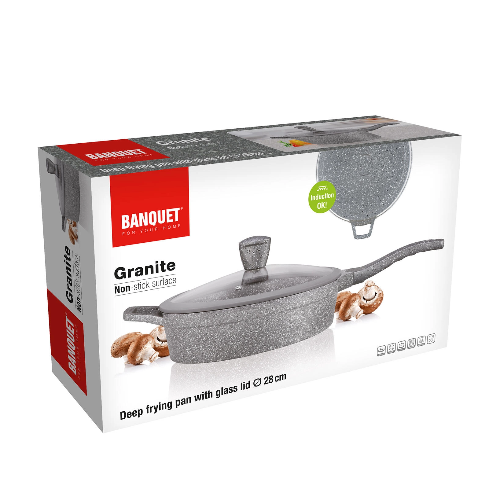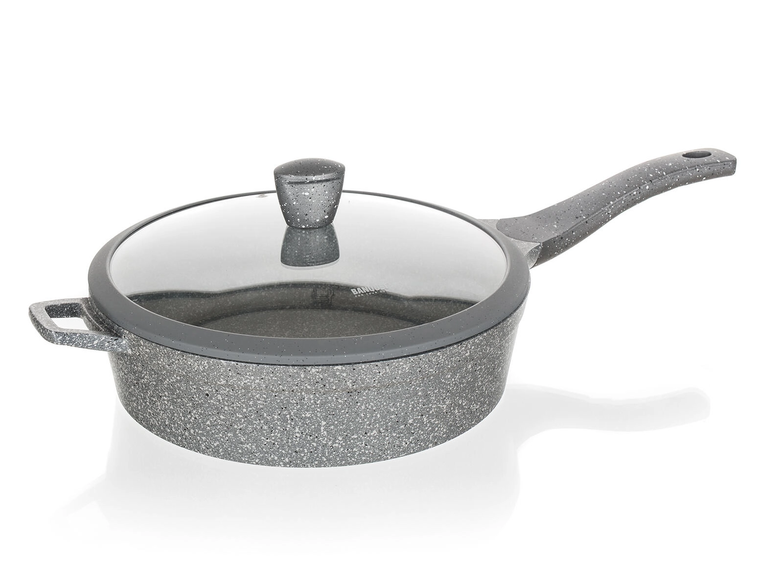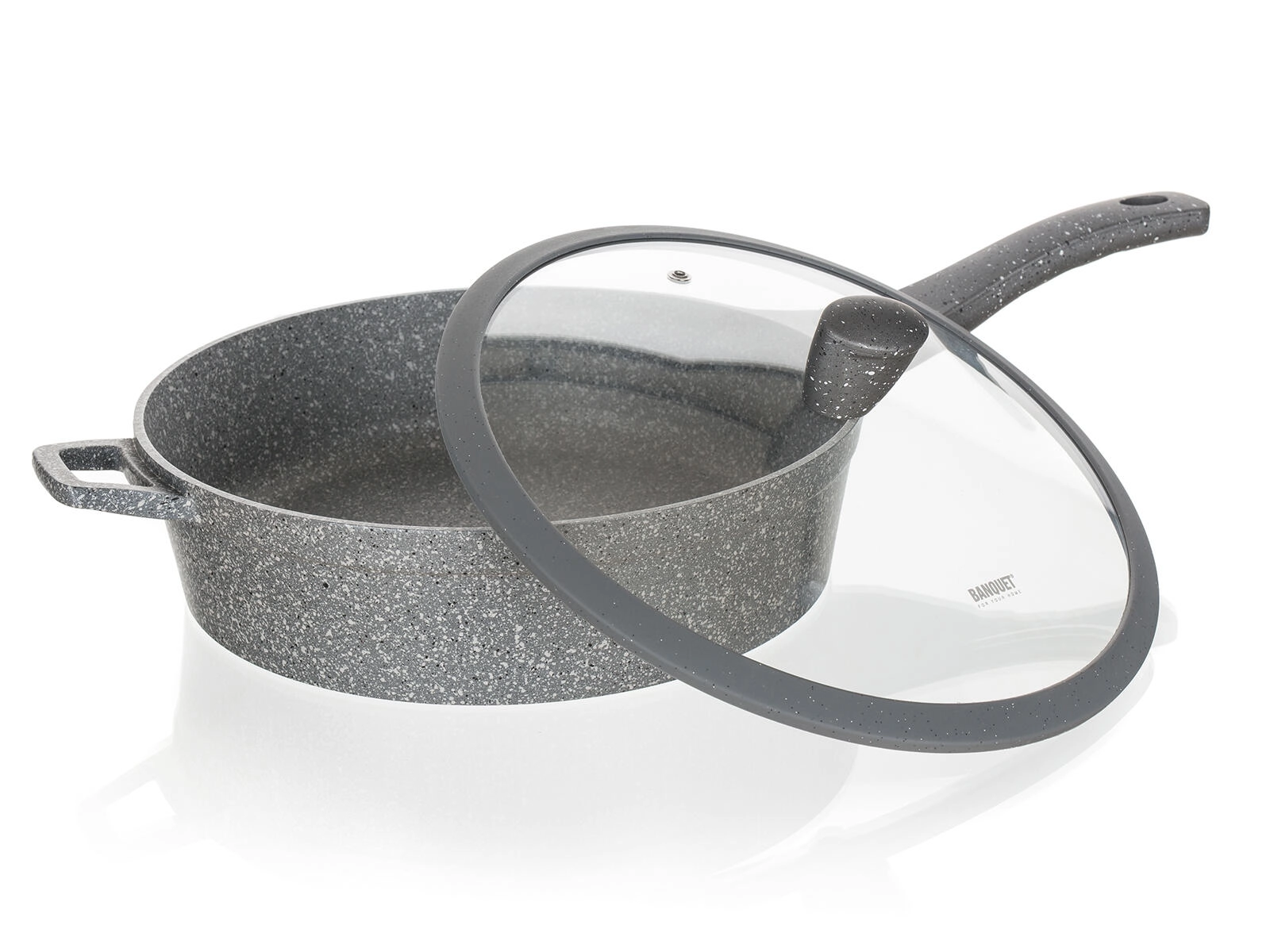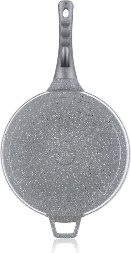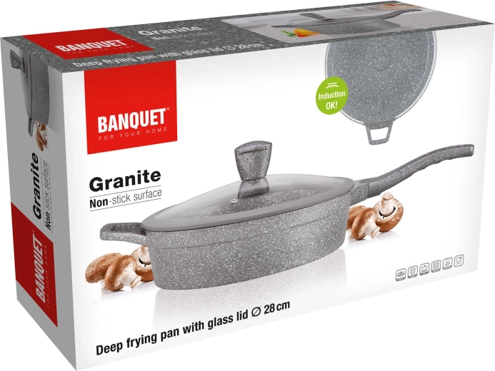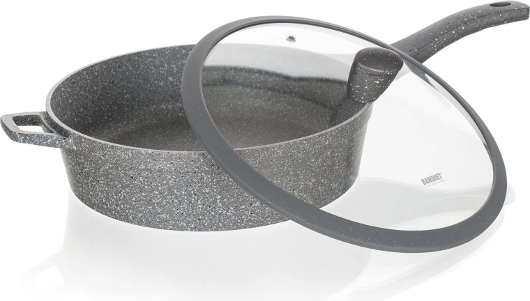 Tato hluboká pánev v šedém granitovém dekoru je ideální pro restování, smažení i dušení. Nepřilnavý povrch minimalizuje potřebu oleje, zabraňuje připalování a usnadňuje čištění. Skleněná poklice s knobem se silikonovým povrchem umožní bezpečnou manipulaci a udrží teplo i vlhkost uvnitř pánve.