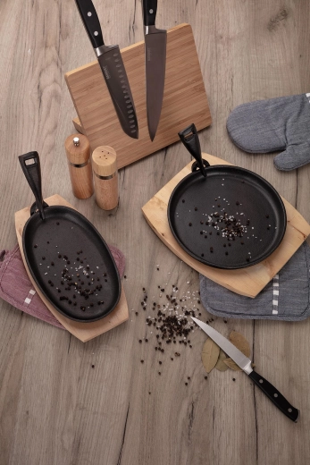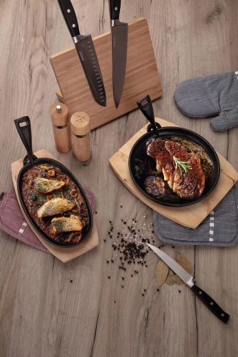 Litinová pánev GRADA o průměru 22 cm je navržena pro intenzivní každodenní použití. Těžká litina skvěle udržuje a rovnoměrně rozvádí teplo, takže dosáhnete perfektního opečení křupavé kůrky i šťavnatého středu. Součástí je dřevěné prkénko, které slouží jako podložka pro bezpečné a stylové servírování přímo na stůl.