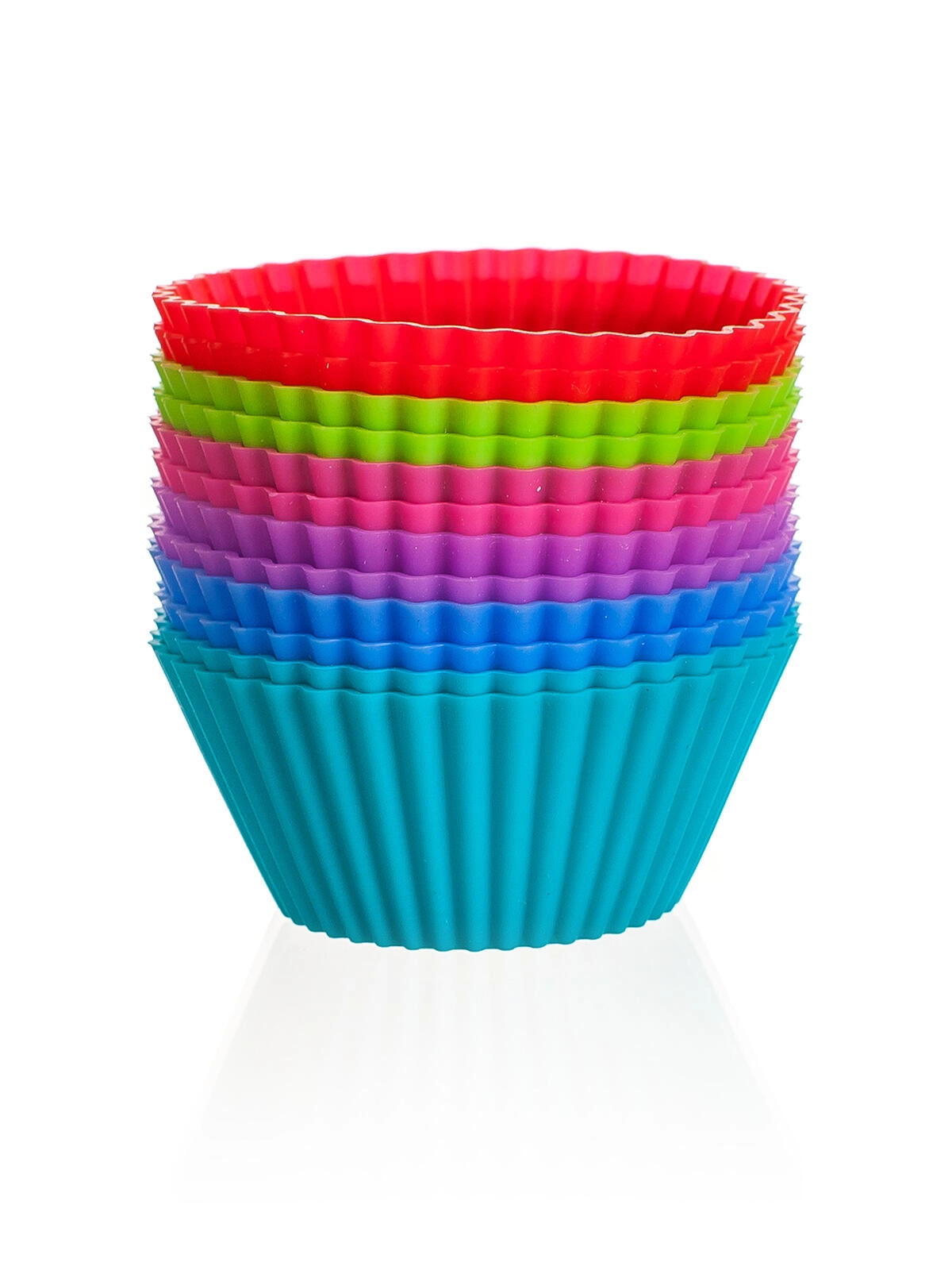 Praktická sada 12 kusů silikonových košíčků na pečení o průměru 6 cm a výšce 2,7 cm v pestrém mixu barev. Snadné vyklápění, opakované použití, odolnost do 230 °C a možnost mytí v myčce dělají z těchto formiček ideální volbu pro domácí pečení muffinů a cupcakes.