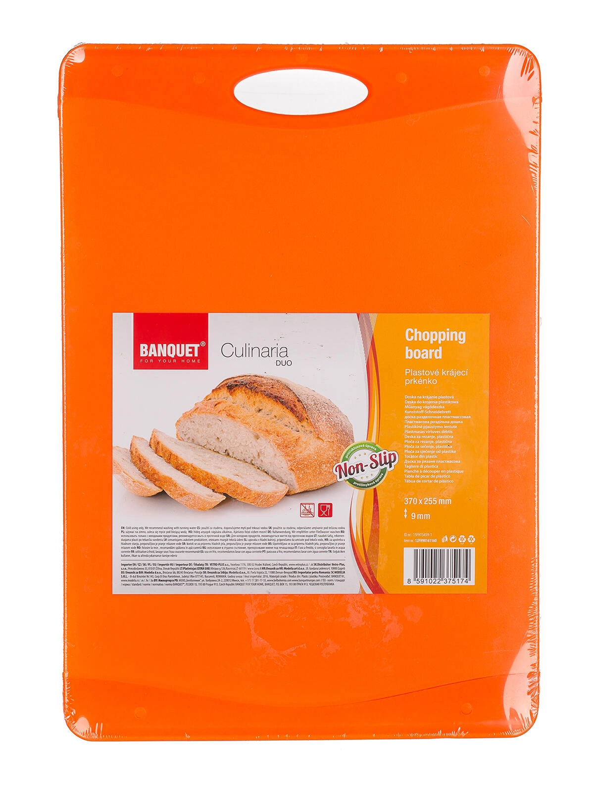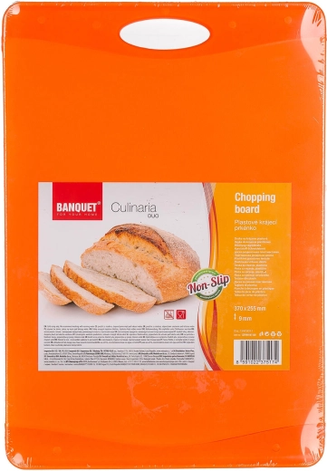 Praktické krájecí prkénko v dvoubarevném oranžovém provedení s protiskluzovou úpravou pro bezpečné a pohodlné krájení. Díky odolnému plastovému materiálu se snadno udržuje a je vhodné pro práci s ocelovými i keramickými noži.