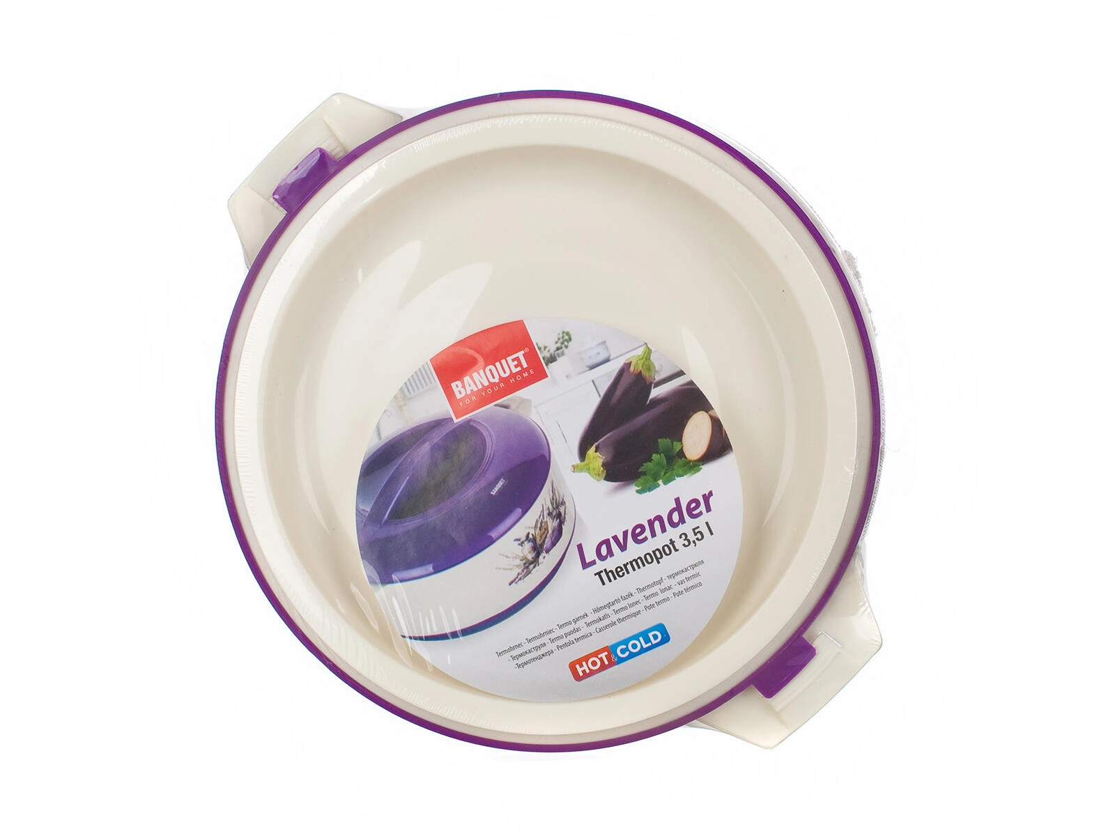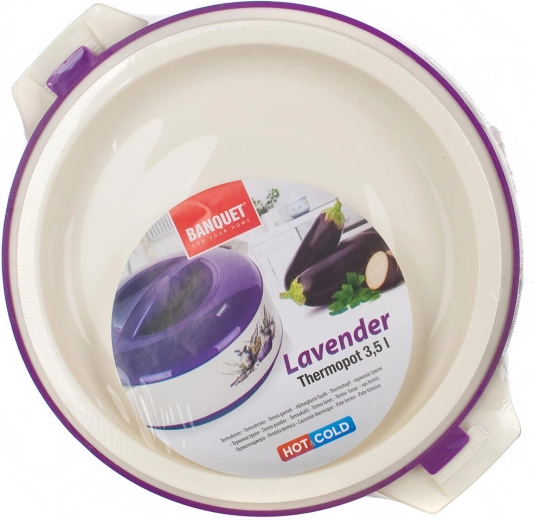 Termomísa Lavender 3,5 l je spolehlivý pomocník do každé kuchyně. Díky kombinaci nerezové vnitřní vložky a výplně z PUR pěny účinně udržuje teplotu pokrmů – ať už horkých, nebo studených. Odolný plast s dekorem levandule dodá servírování příjemný vzhled a víko zajistí bezpečné přenášení bez rozlití.