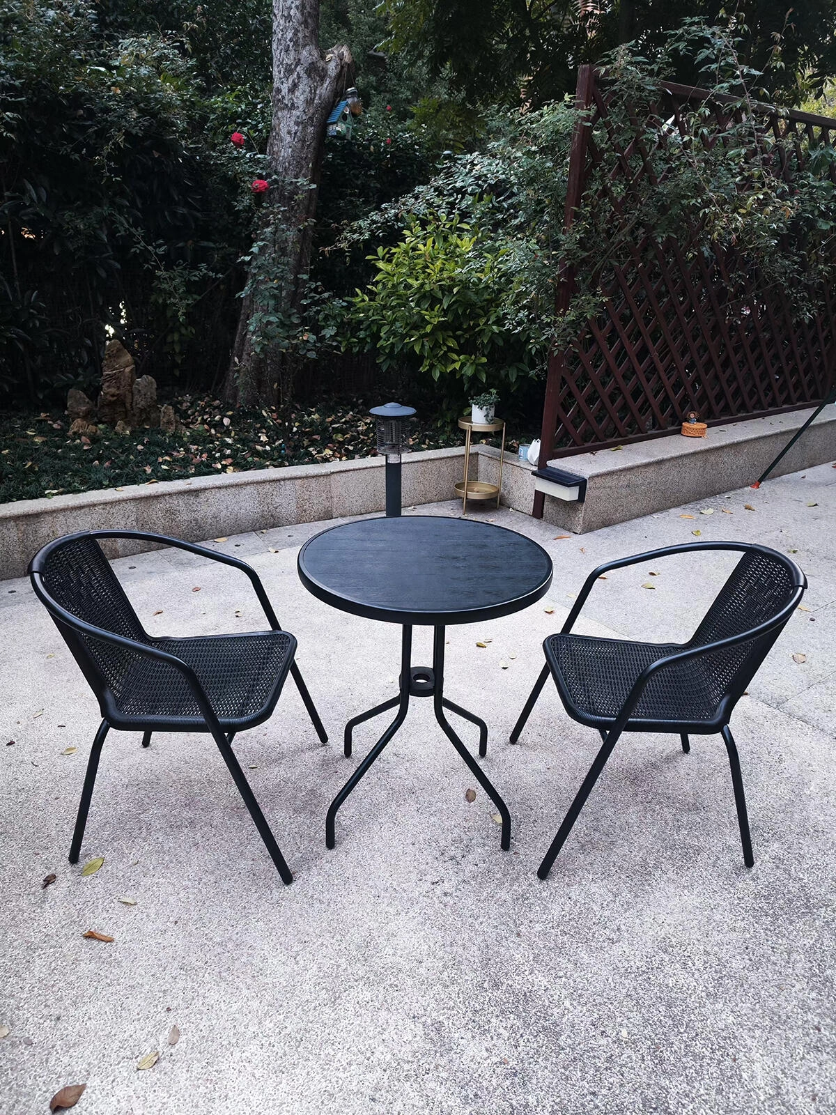 Elegantní černý set zahradního nábytku je navržen pro pohodlné sezení ve dvojici a skvěle zapadne do malých i větších venkovních prostor. Židle s ratanovým vzhledem z PH a stabilní kovový rám zajišťují dlouhou životnost a snadnou údržbu, zatímco kompaktní kulatý stůl je ideální pro nápoje a drobné občerstvení.