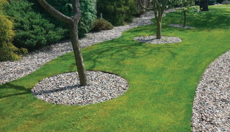 Lem vytváří čisté linie kolem trávníku, štěrkových ploch a mulče. Zamezuje prorůstání plevelů do okrajů a pomáhá udržet vlhkost v zónách s kamennou nebo kůrovou mulčí.