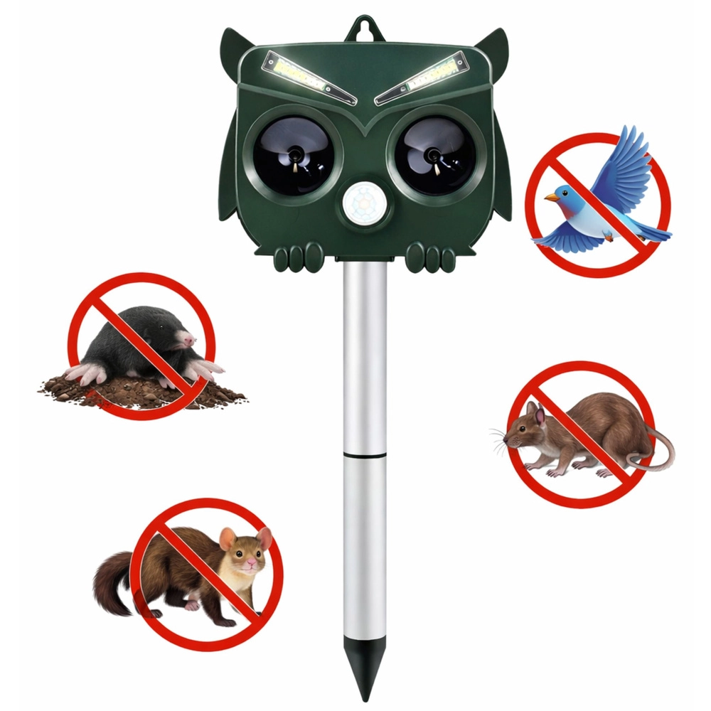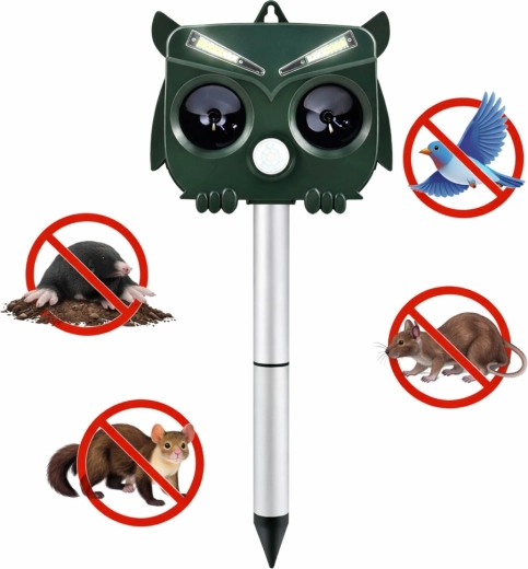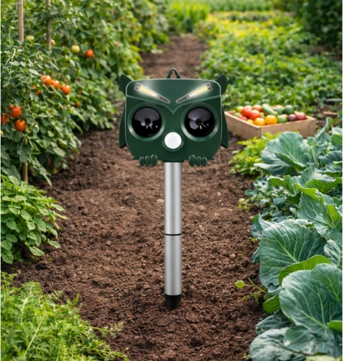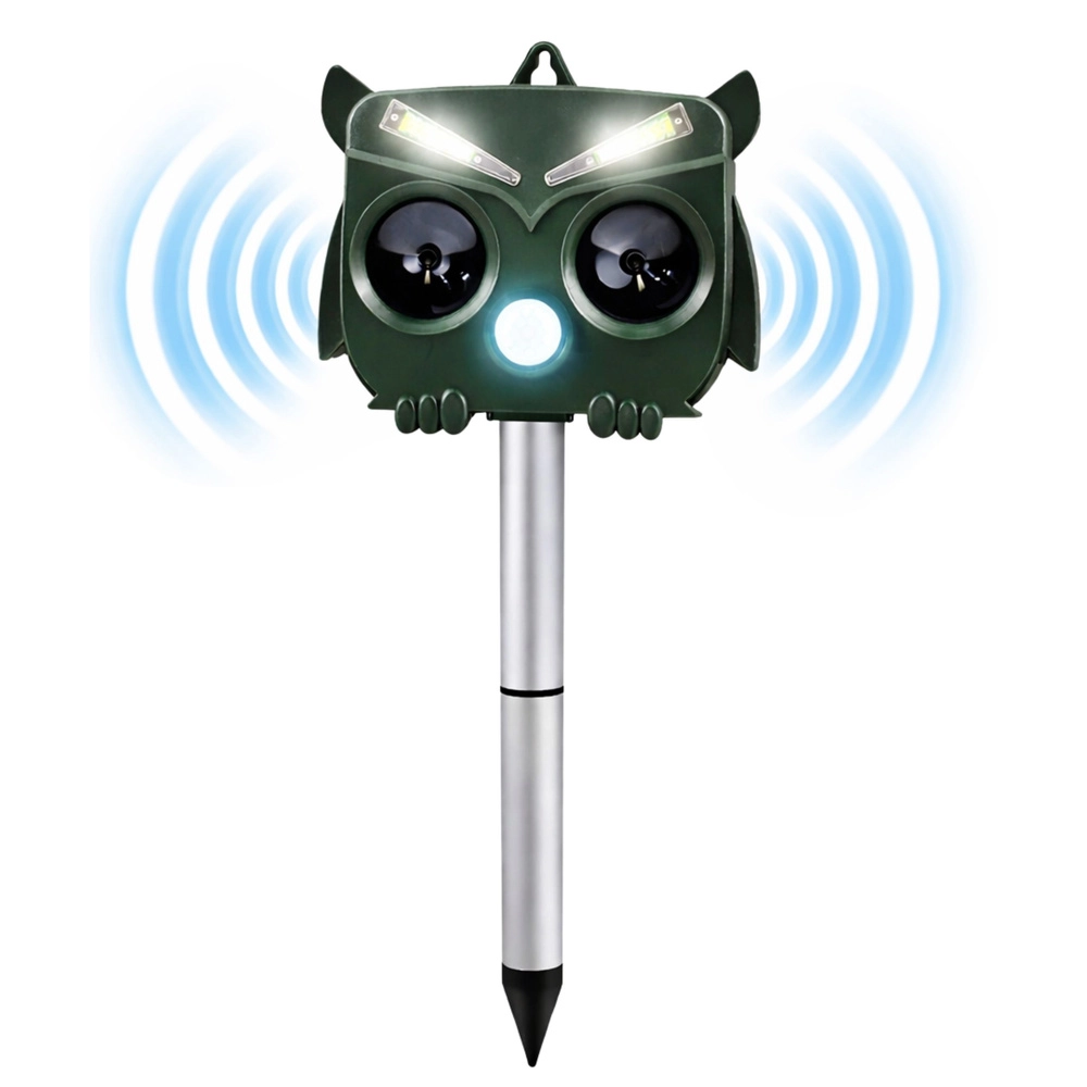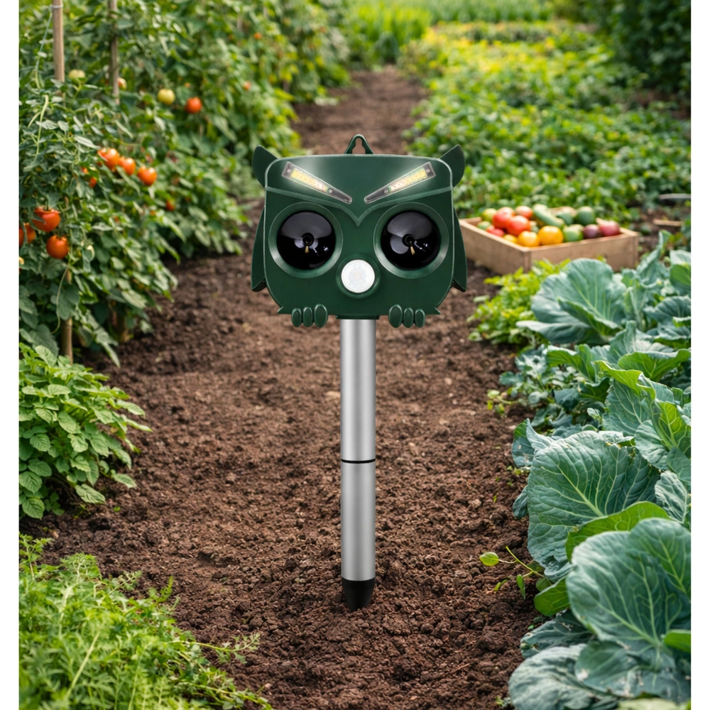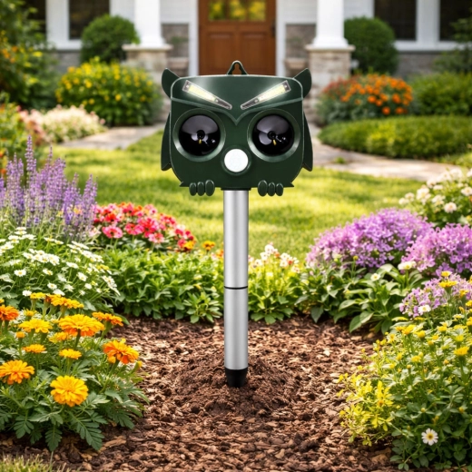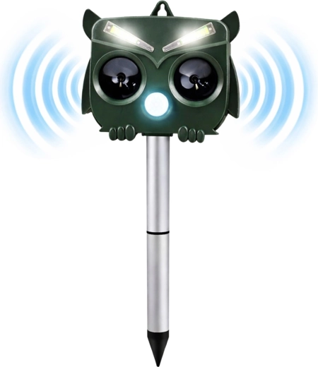Chraňte zahradu ekologicky a bez chemie se sovím odpuzovačem na solární pohon. Zařízení s PIR čidlem pohybu se aktivuje jen při detekci zvířete a kombinuje ultrazvuk, zvukové signály a blikající LED pro účinné, ale šetrné odrazení koček, ptáků, hlodavců a další zvěře. Nabíjení probíhá solárně nebo přes USB, montáž je snadná pomocí zemního hrotu či závěsného oka.