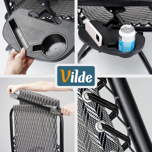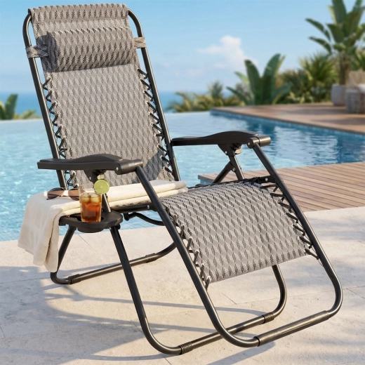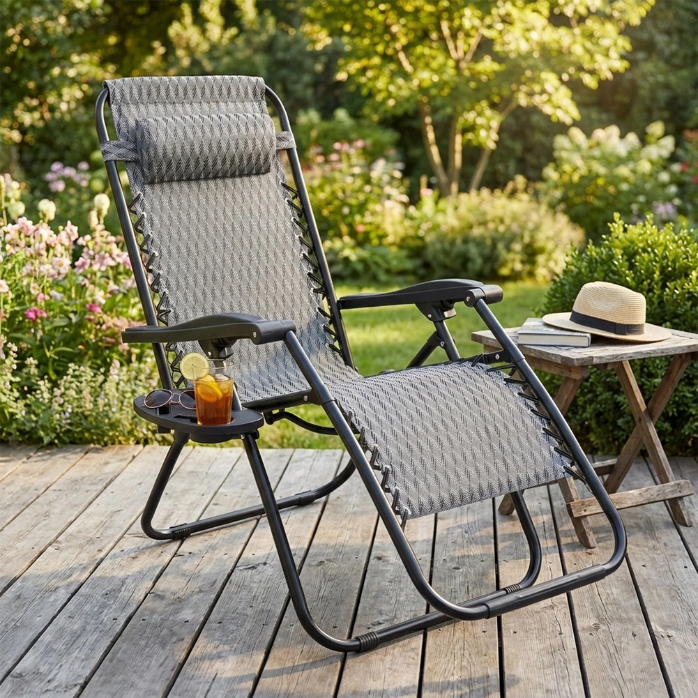 Součástí je měkký, odnímatelný polštářek pro oporu krku a praktický boční stolek s držákem na nápoj a telefon, abyste měli vše po ruce. Lehátko se rychle skládá do kompaktních rozměrů, takže je ideální na zahradu, terasu, balkon, pláž i kemp.