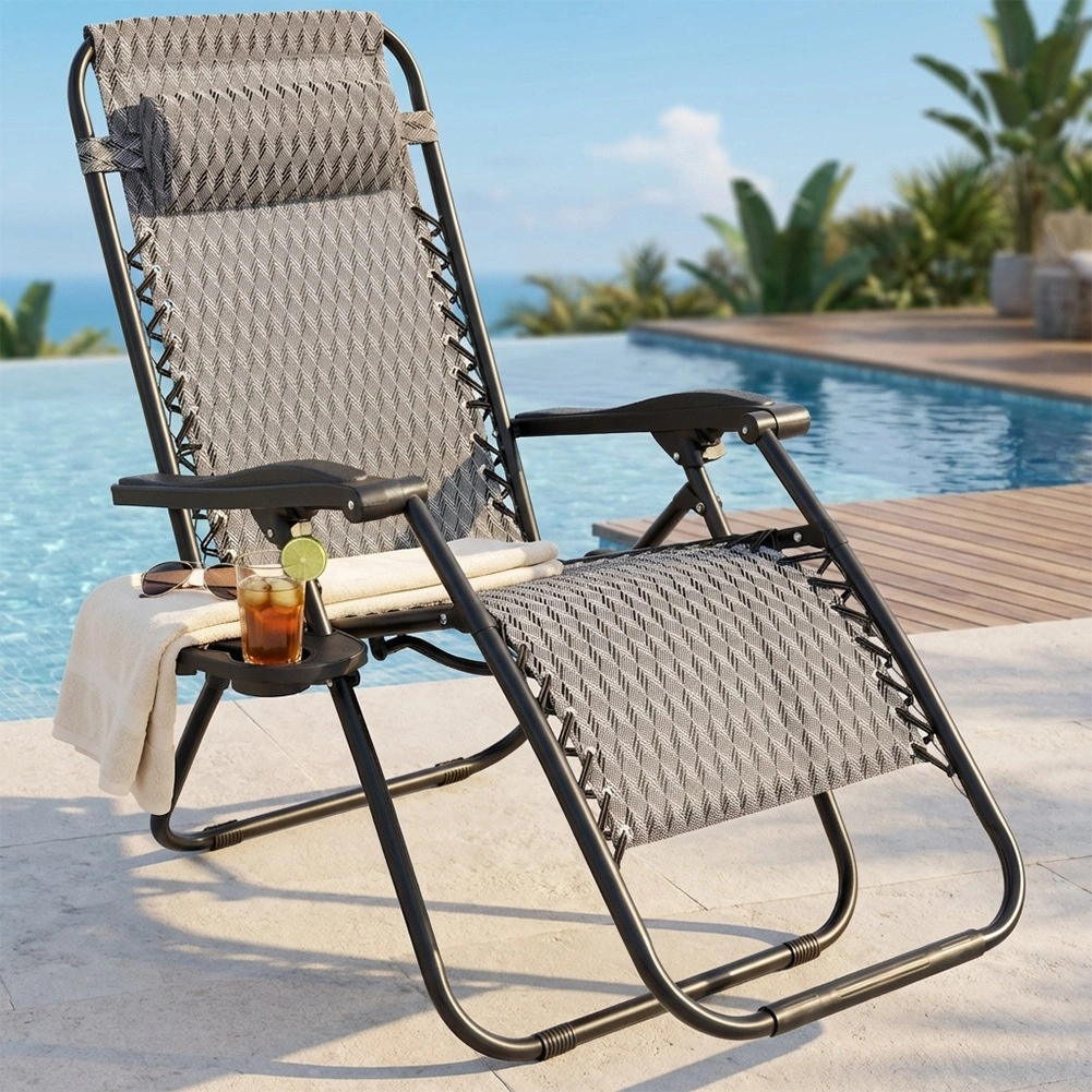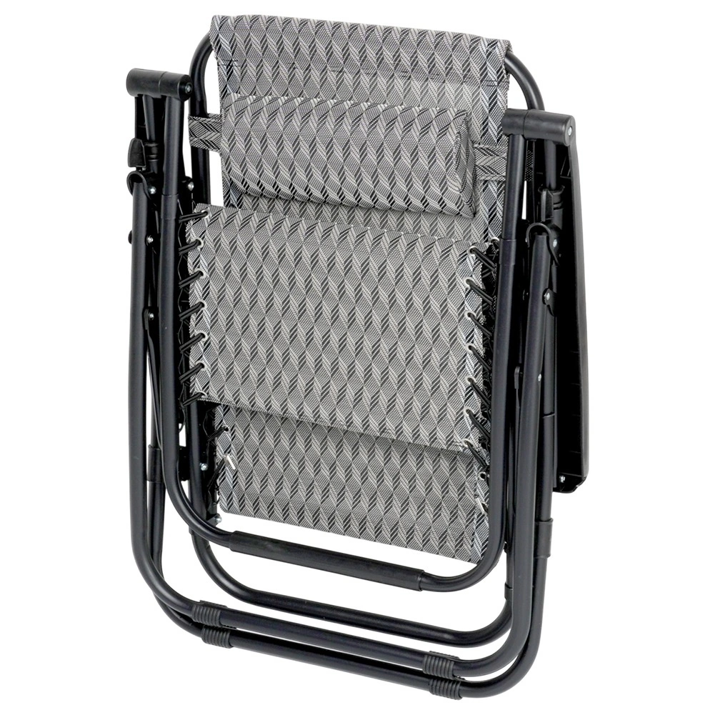 Gravitační polohování umožňuje snadno měnit polohu těla pro maximální komfort při čtení, opalování i relaxu. Stabilní kovová konstrukce s nosností až 120 kg a pevný potah z polyesterové tkaniny v šedé barvě s geometrickým vzorem zaručují dlouhou životnost i venku.