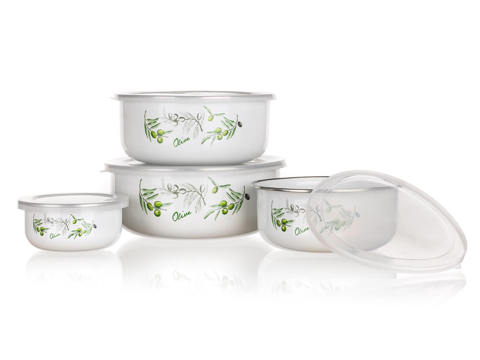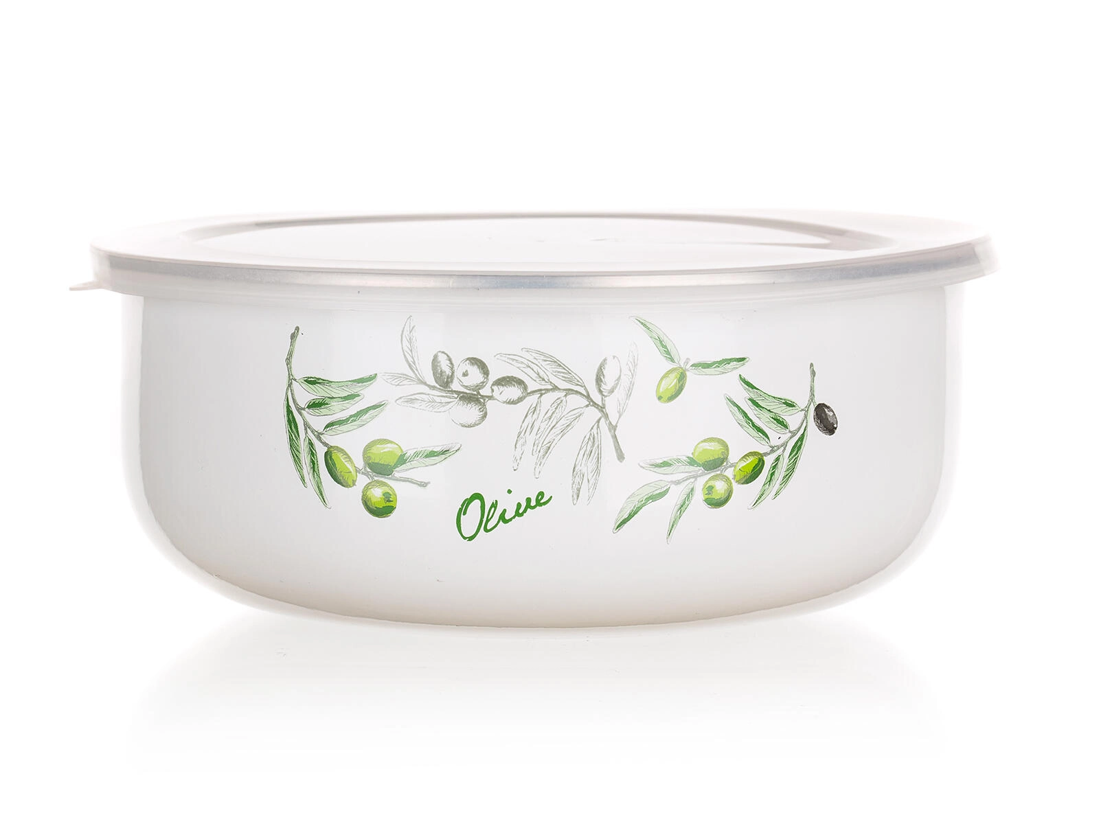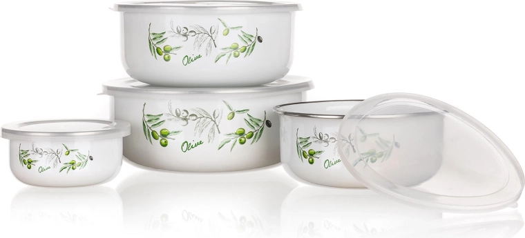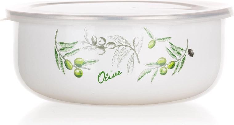Sada misek OLIVES přináší spojení nadčasového smaltu a praktických průhledných víček. Čtyři velikosti od 0,2 do 1,3 litru pokryjí svačiny, přílohy i zbytky jídel. Elegantní bílý povrch s dekorem oliv se hodí do každé kuchyně a z misek dělá i pěkné servírovací nádobí.