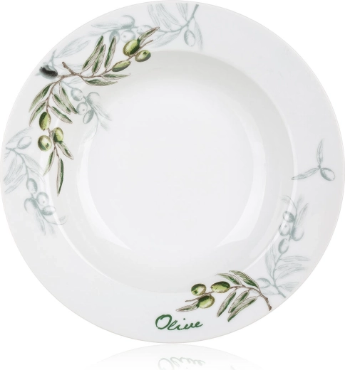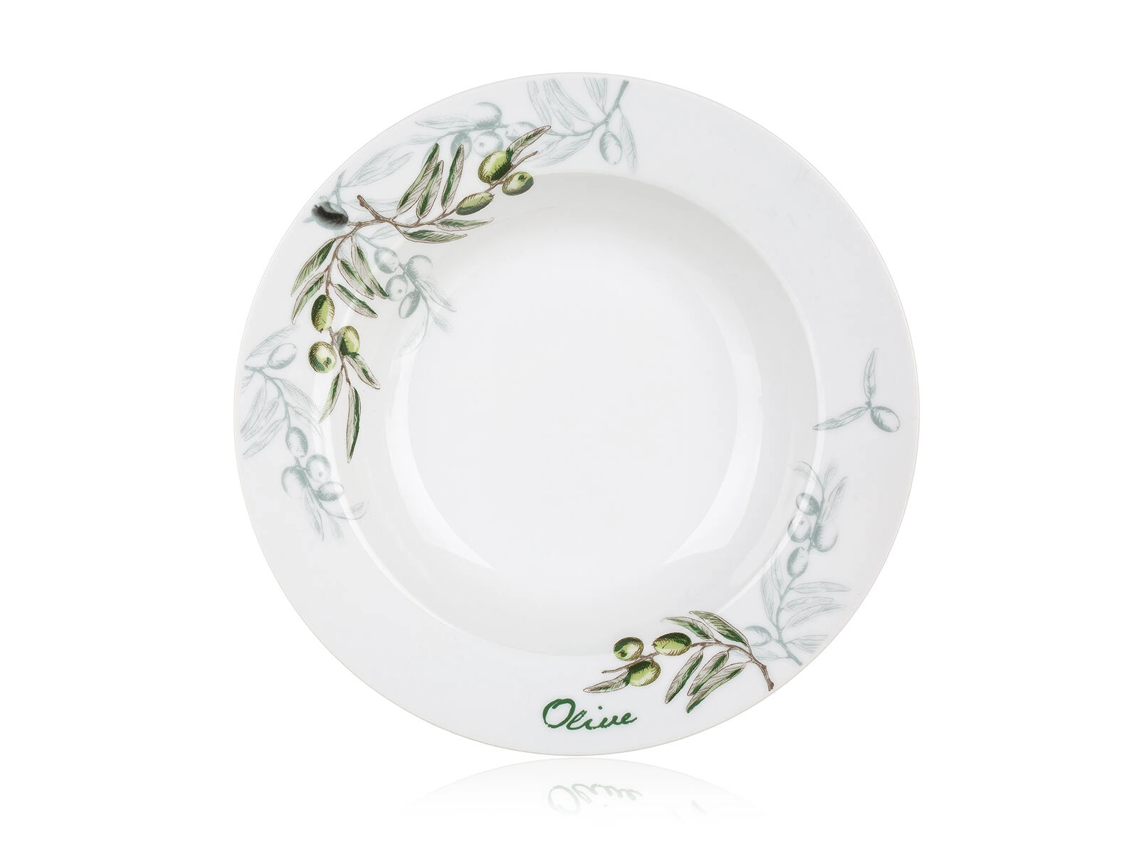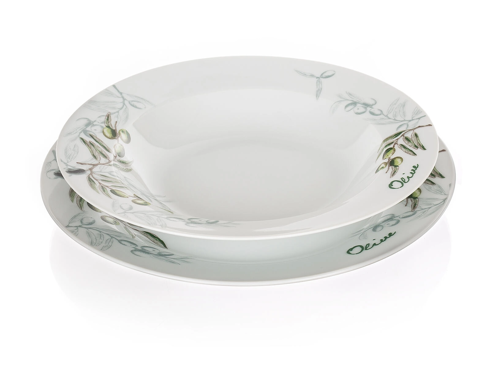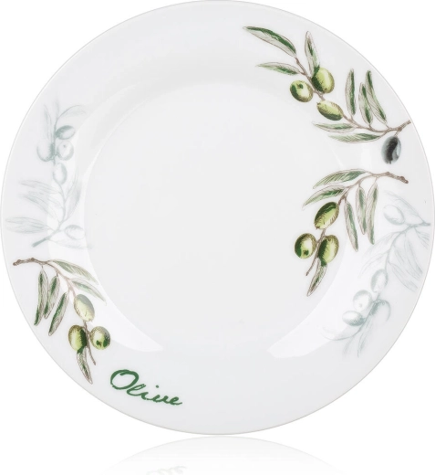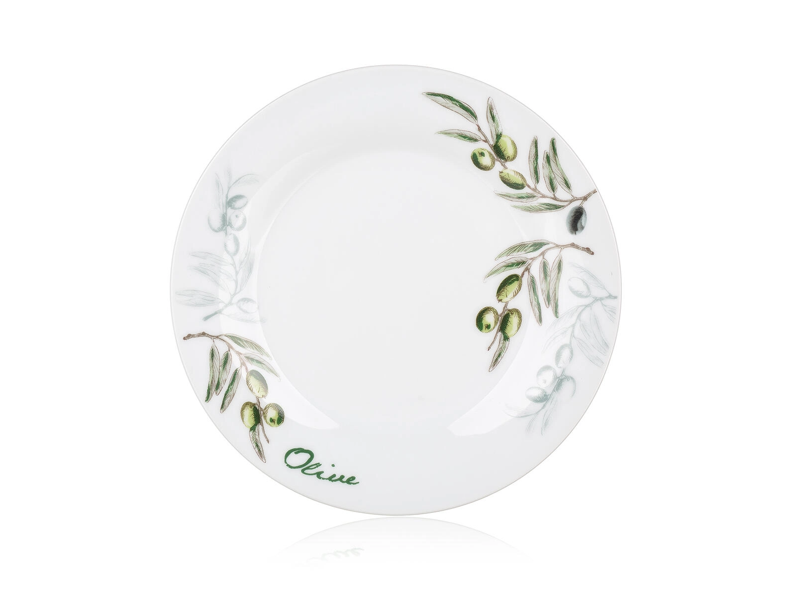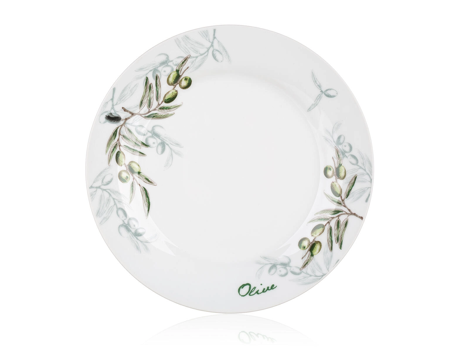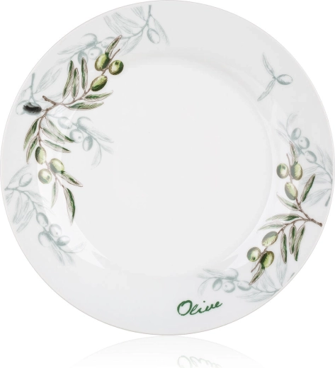 Decentní motiv oliv v zeleno‑šedých tónech rozzáří každý stůl a snadno se kombinuje s dalším nádobím i dekoracemi.