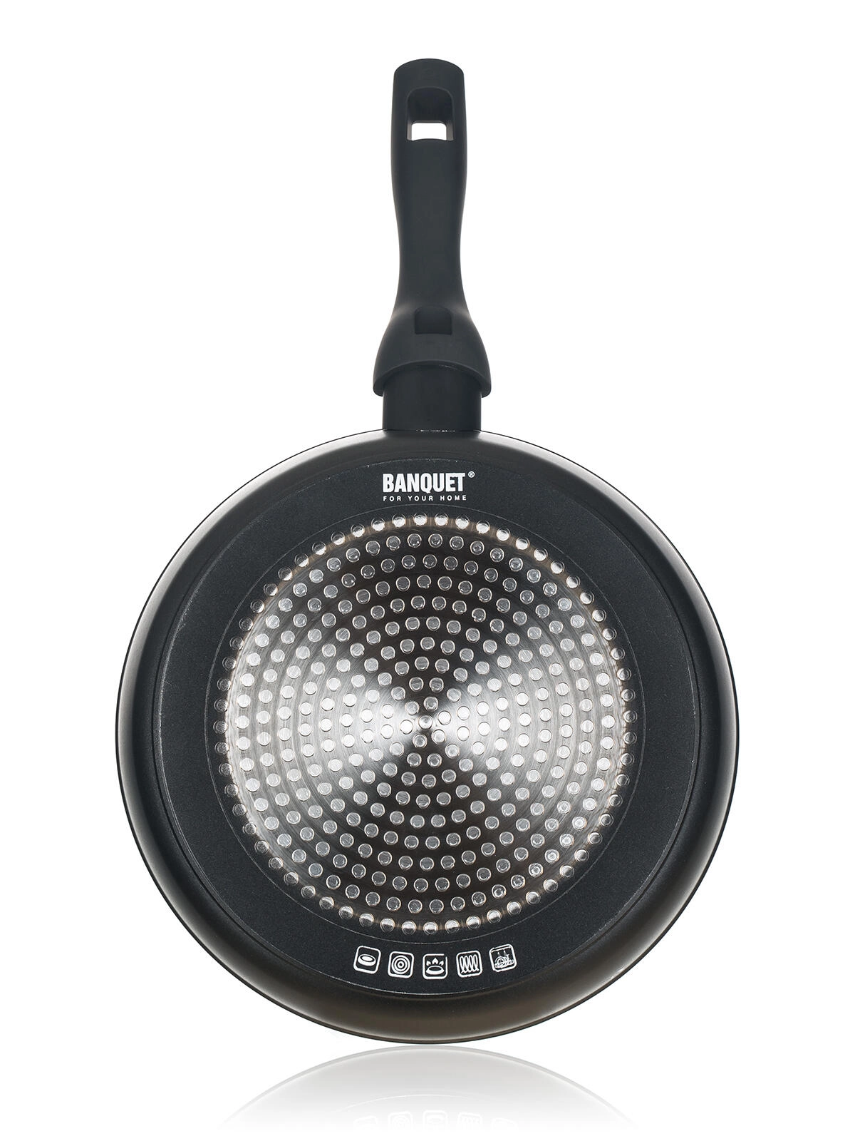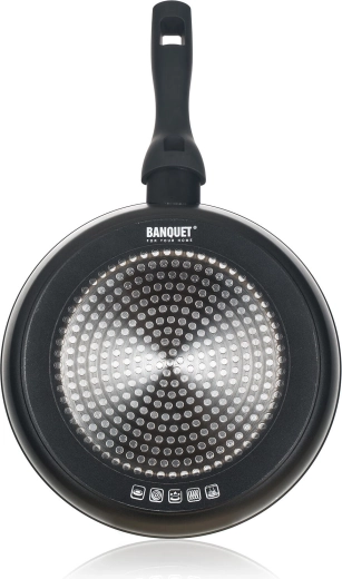 Vnější povrch tvoří 2vrstvý žáruvzdorný nástřik v elegantní matně černé barvě. Indukční nerezové dno s laserovým potiskem je kompatibilní se všemi typy vařičů včetně indukce a podporuje efektivní využití energie.