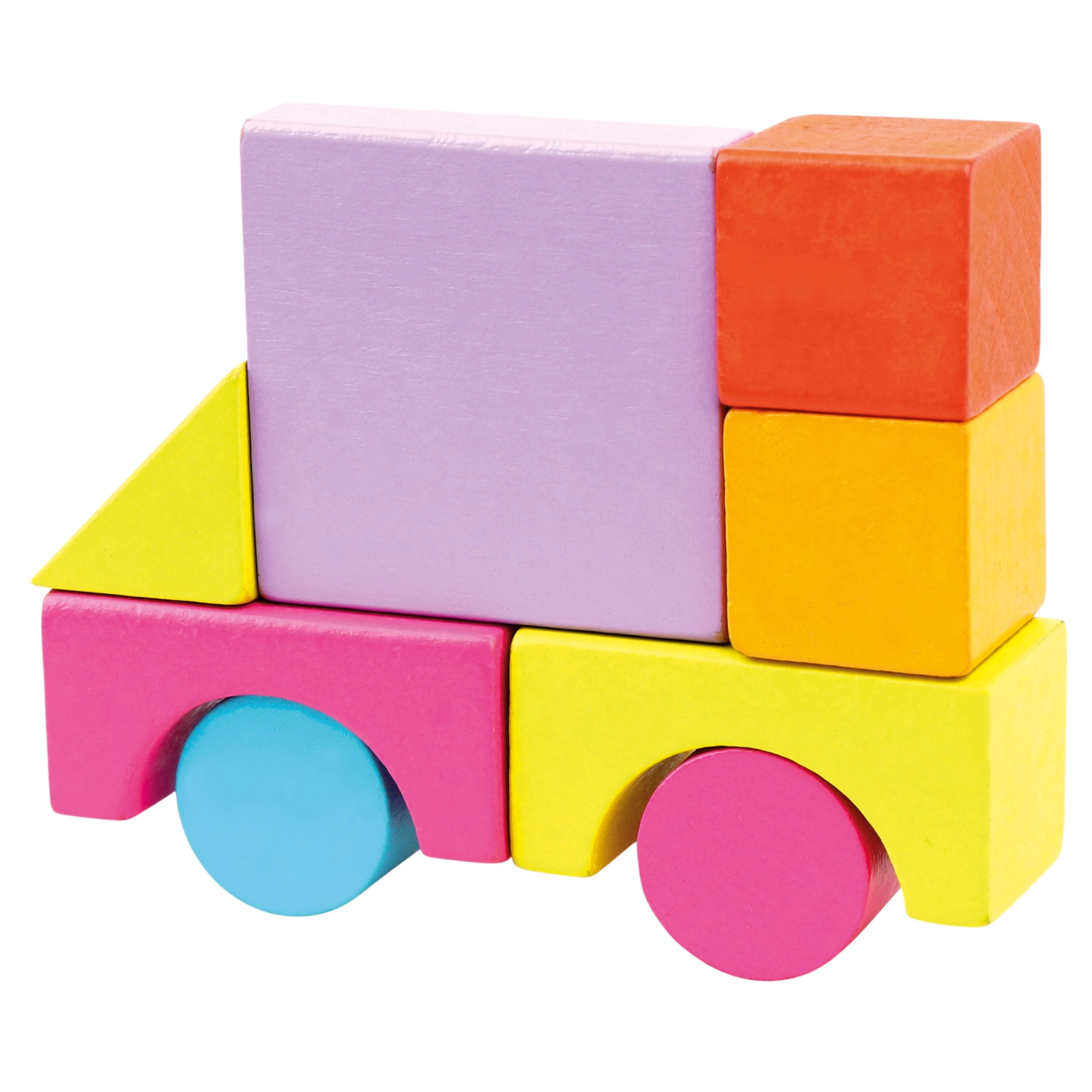 Ideální pro děti od 1 roku: kostky mají příjemně hladký povrch, pestré nezávadné barvy a tvarově pestrou škálu – od kostek a kvádrů přes válce až po oblouky a trojúhelníky. Hra s kostkami podporuje rozvoj prostorového vnímání, tvořivosti i koordinace oko–ruka.