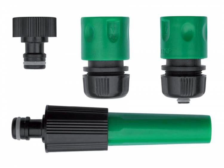 Rychlospojky a adaptér na kohoutek umožní snadné propojení s běžnými zahradními armaturami. Nastavitelná tryska nabídne od mlhy po koncentrovaný proud.