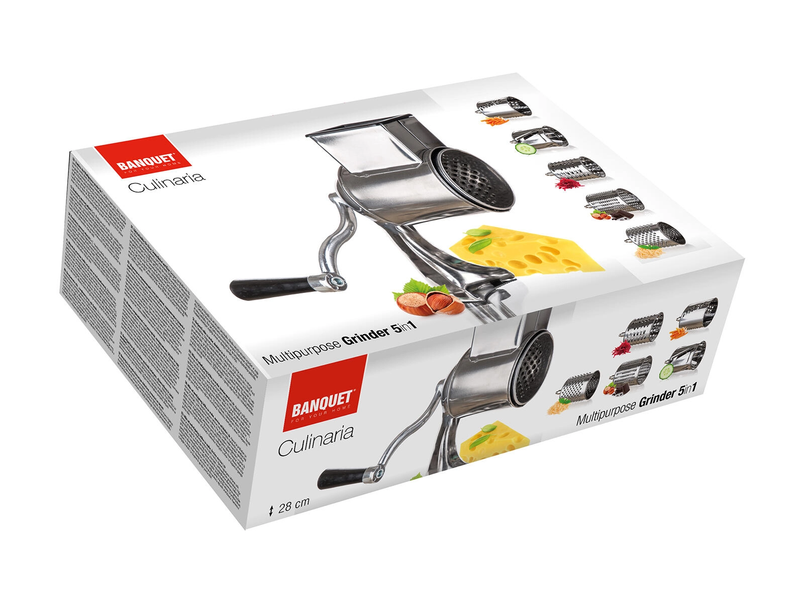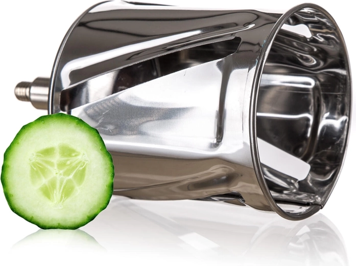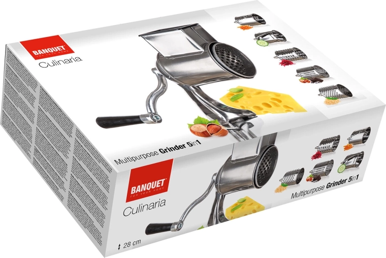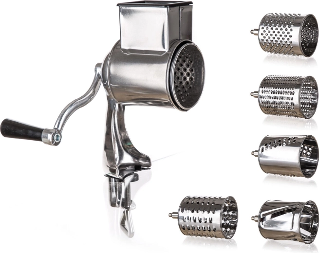 Užijte si rychlou a rovnoměrnou přípravu surovin s multifunkčním nerezovým struhadlem 5v1. Robustní kovové tělo s upínací svorkou drží pevně na pracovní desce, ruční klika zajišťuje plynulý chod a pět bubnových nástavců pokryje jemné i hrubé strouhání, krájení plátků i julienne.