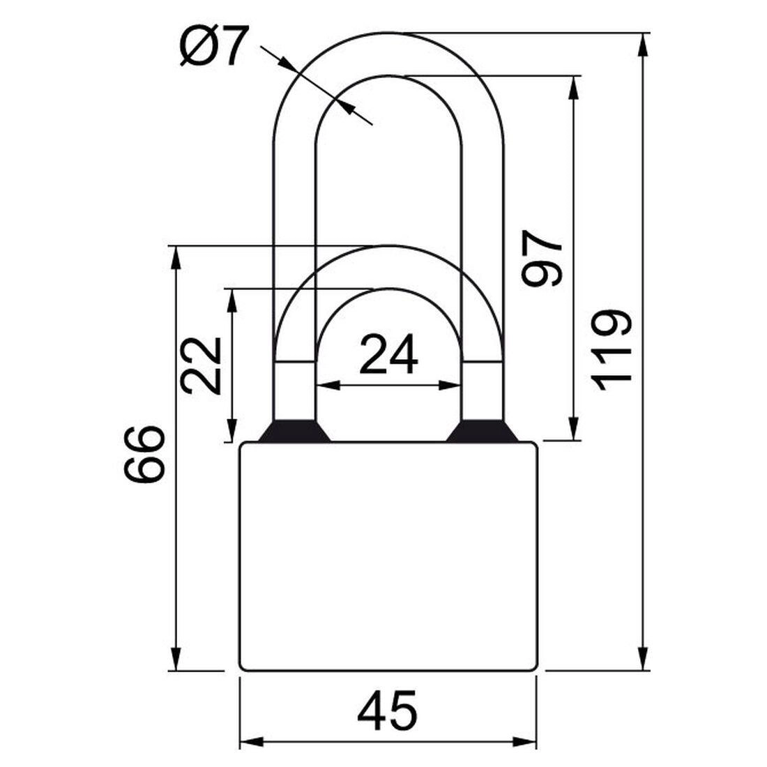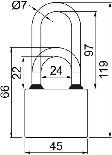 Robustní litinové těleso, povrchově upravené modrým komaxitem, zajišťuje dlouhou životnost i při náročnějším použití. Prodloužený třmen usnadňuje uzamykání širších ok a kování, přičemž dvojité jištění zvyšuje odolnost proti vypáčení. Gumové kroužky minimalizují pronikání vody do těla zámku.
