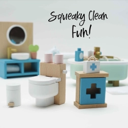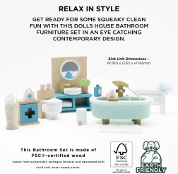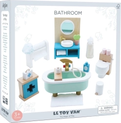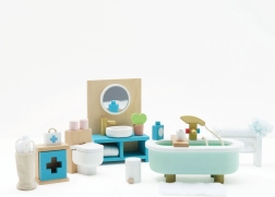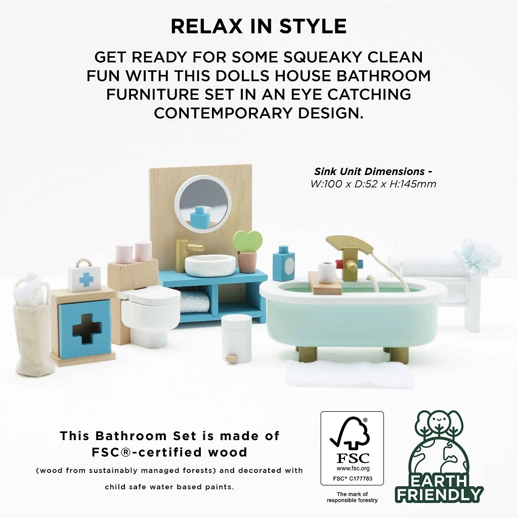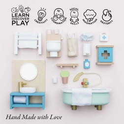 Stylová sada koupelnového nábytku pro domeček pro panenky v měřítku 1:12 od značky LE TOY VAN. Obsahuje vanu, toaletu, umyvadlo, věšák na ručníky a lékárničku, ručně domalovanou netoxickými barvami na bázi vody. Vyrobeno eticky z udržitelných materiálů, podporuje kreativní hru, komunikační dovednosti a koordinaci.
