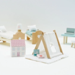 Tato elegantní 24dílná sada do dětského pokoje pro panenky obsahuje postele s polštáři a peřinami, noční stolek s lampičkou, židličku, koberec a dekorace, které dodávají realistický vzhled. Dřevěné detaily a jemné pastelové barvy přinášejí nádech stylu a elegance. Vyrobeno eticky z udržitelných materiálů a malováno netoxickými barvami na bázi vody.