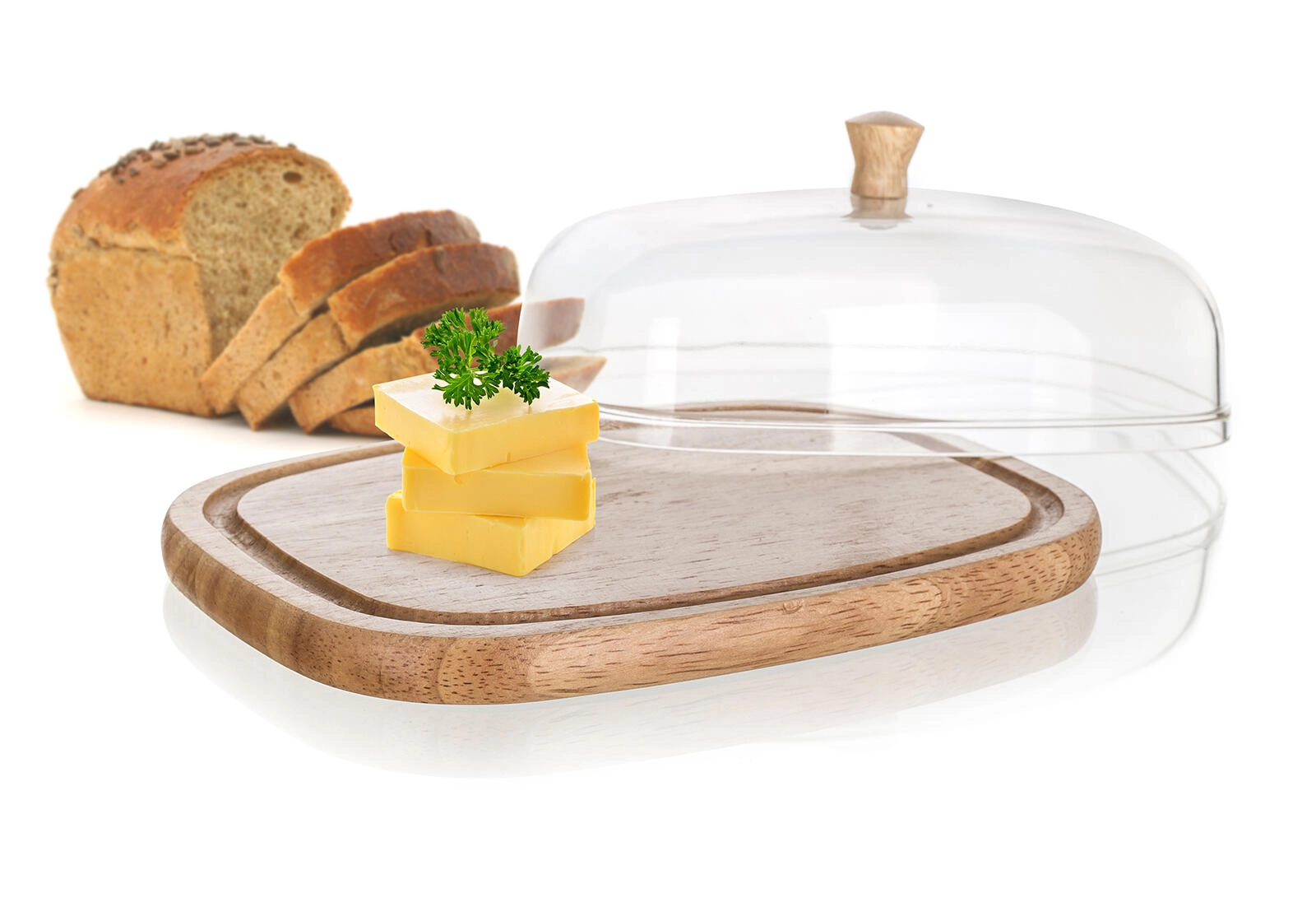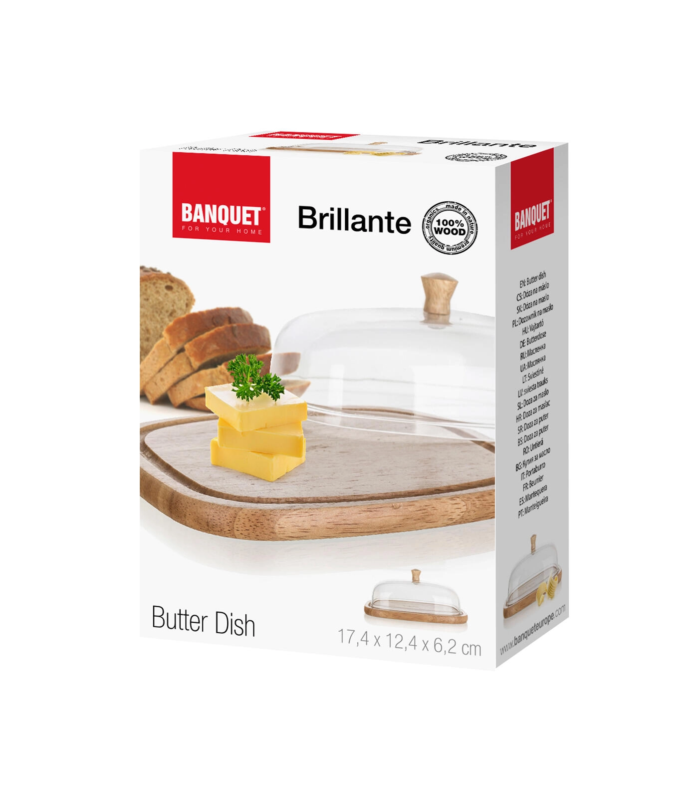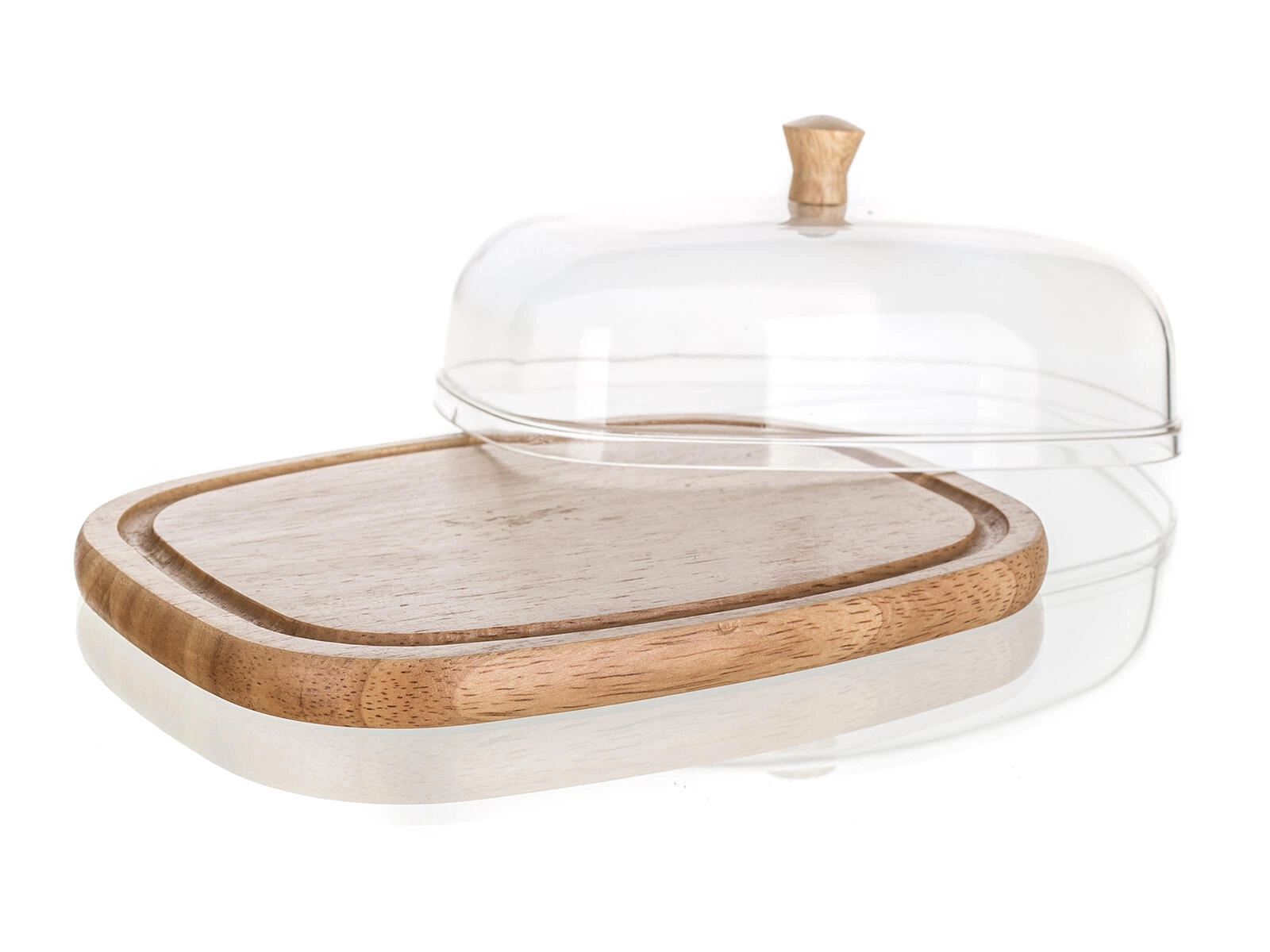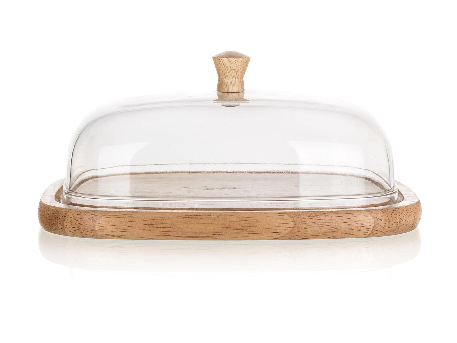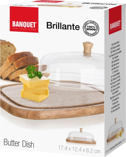 Stylová dóza na máslo a sýry BRILLANTE je praktickým doplňkem každé kuchyně i jídelního stolu. Čirý akrylový poklop s dřevěným knobem chrání potraviny před osycháním a nežádoucími pachy, zatímco přírodní gumovníkové dřevo podnosu dodá servírování teplý, moderní vzhled.
