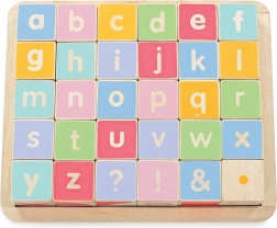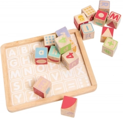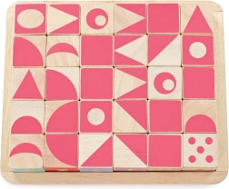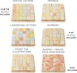 Zaoblené hrany kostek i úložné desky zajišťují komfortní a bezpečnou manipulaci. Hračka je bez obsahu plastu, vyrobená z FSC certifikovaného dřeva s důrazem na etickou výrobu a udržitelnost. Sada podporuje rozvoj kognitivních dovedností, prostorové představivosti a jazykových schopností.