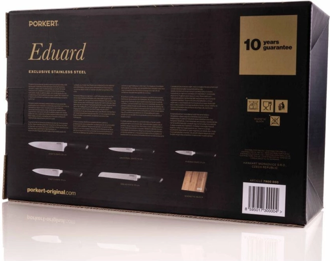 Univerzální sada nožů EDUARD je navržena tak, aby pokryla všechny běžné kuchyňské úkony – od krájení křupavého pečiva až po jemné plátkování masa. Čepele z oceli X50CrMoV15 (ISO 1.4116) s tvrdostí HRC 55 ±2 drží ostří, snadno se udržují a poskytují plynulý řez bez trhání.