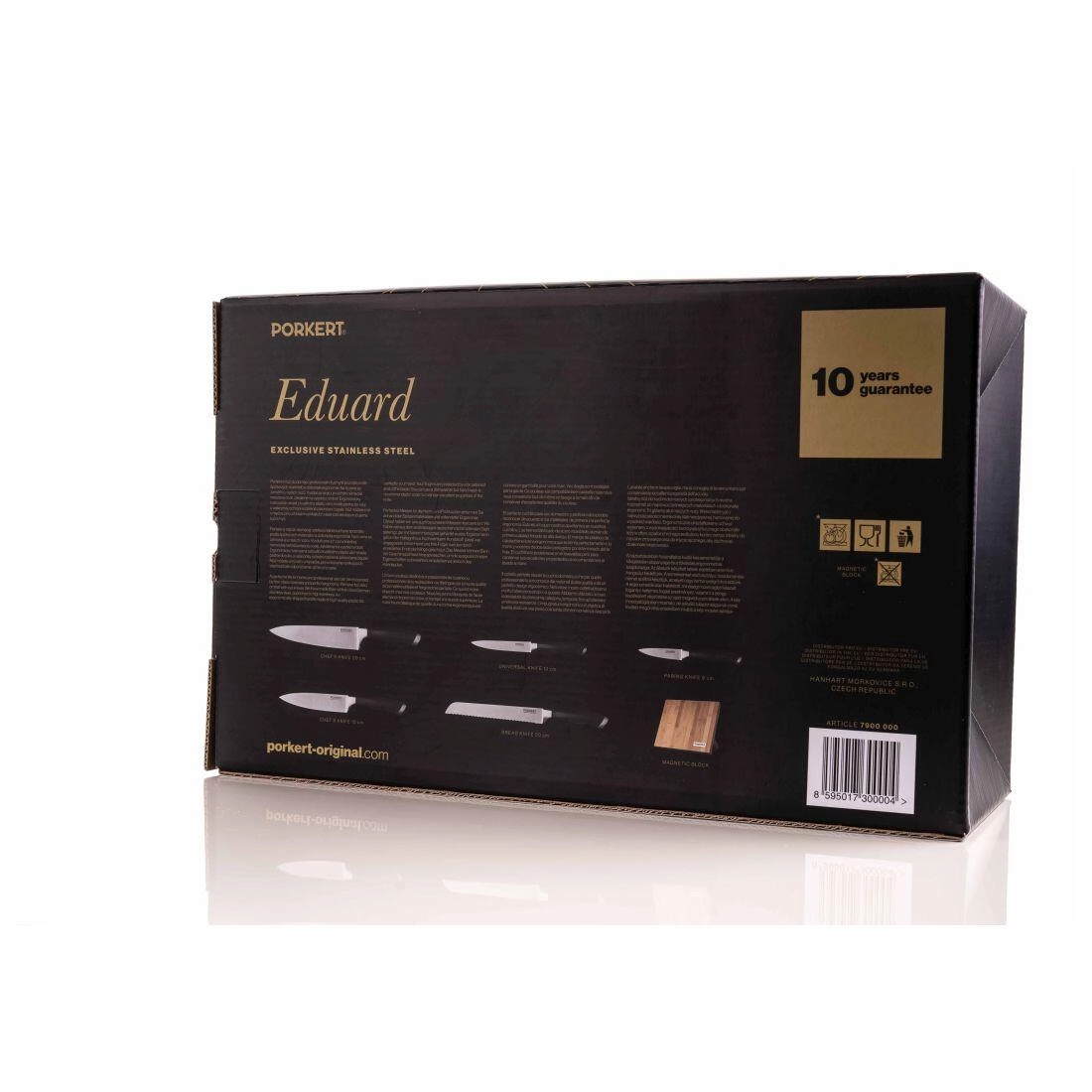 Designový magnetický blok z bambusu udržuje nože přehledně na očích, chrání ostří a šetří místo na lince. Leštěné, odolné plastové rukojeti jsou ergonomické, příjemné do ruky a spolu s chráničem prstu přinášejí jistotu a bezpečí při každém krájení.