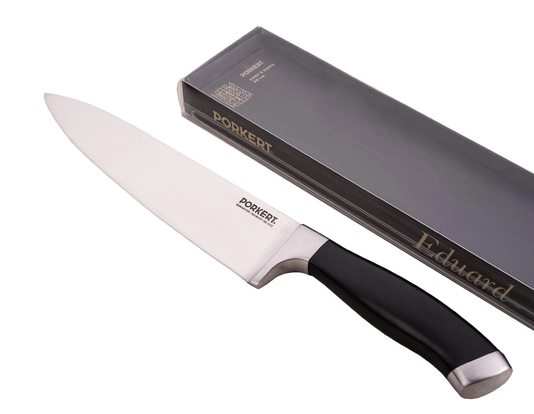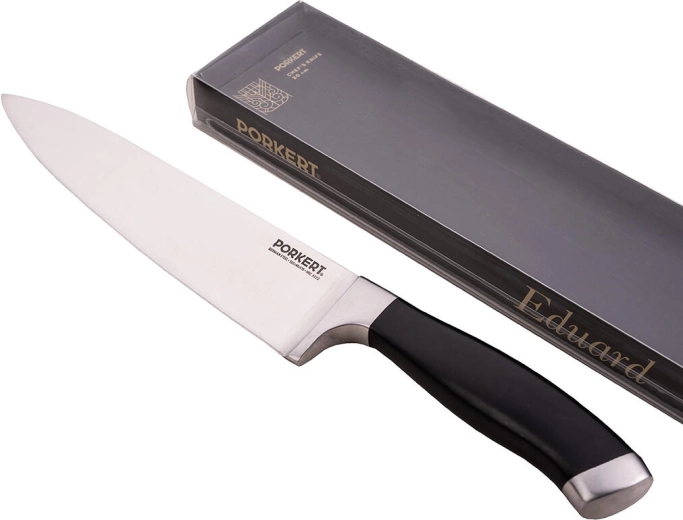 Univerzální kuchařský nůž EDUARD s délkou čepele 20 cm je spolehlivý pomocník pro každodenní krájení, sekání i porcování. Nabízí kvalitní ocel X50CrMoV15, tvrdost HRC 55 ±2 pro dlouhou ostrost a odolnou, leštěnou plastovou rukojeť pro jistý a pohodlný úchop.