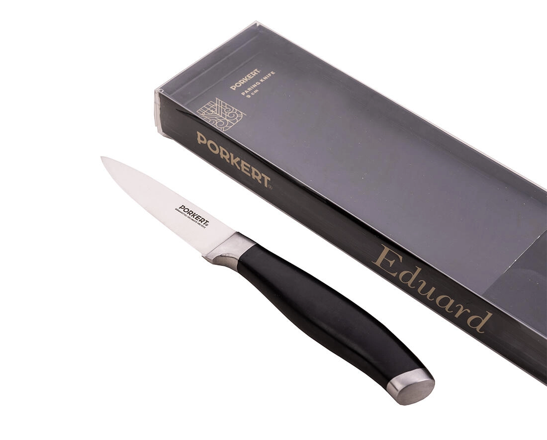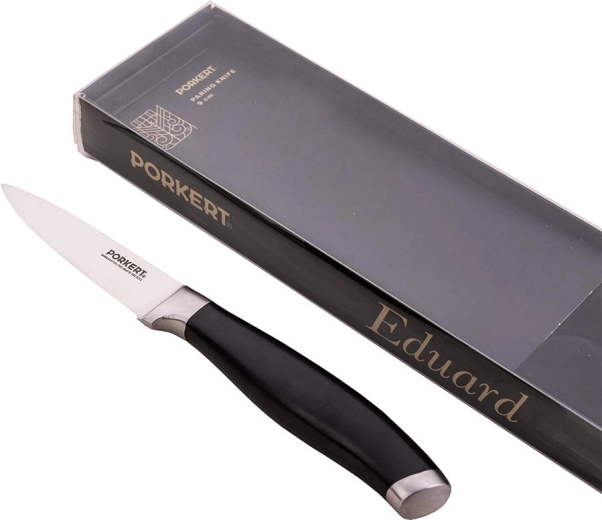 Malý a praktický vykrajovací nůž EDUARD s délkou čepele 9 cm je ideální pro každodenní práci v kuchyni. Nabízí dokonale ostrou čepel z kvalitní oceli X50CrMoV15, pohodlnou a odolnou rukojeť z leštěného plastu a spolehlivou tvrdost HRC 55 ±2 pro přesné krájení a vykrajování ovoce, zeleniny či menších surovin.
