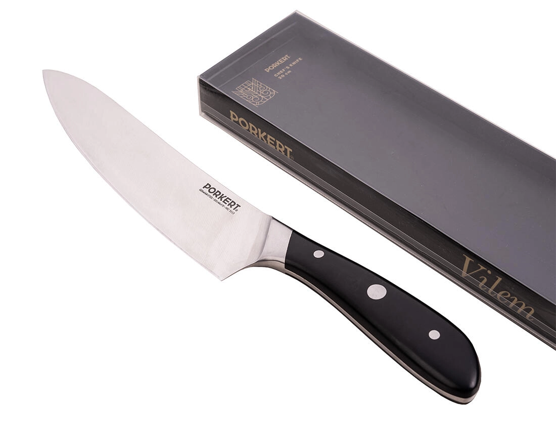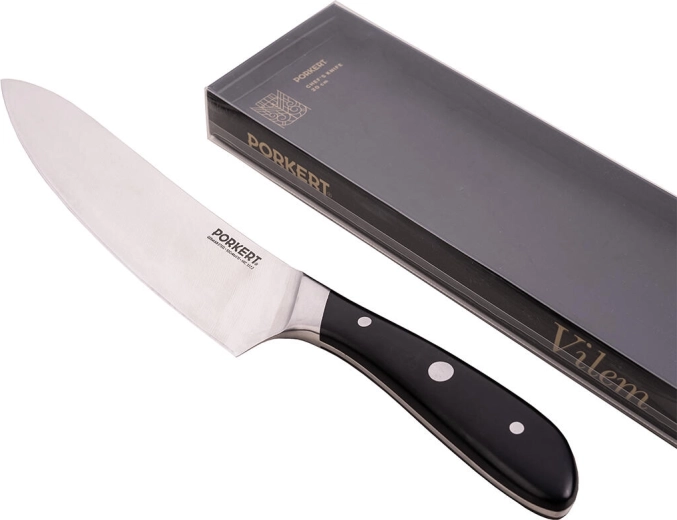 Kuchařský nůž Vilem s délkou čepele 20 cm je univerzální volbou do každé kuchyně. Kvalitní ocel X50CrMoV15 (ISO 1.4116) zajišťuje vyváženou kombinaci ostrosti, odolnosti proti korozi a snadného broušení. Ergonomická leštěná plastová rukojeť poskytuje jistý a pohodlný úchop i při delší práci.