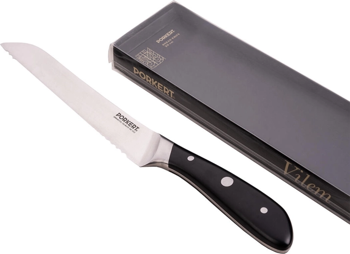 Nůž na pečivo Vilem je spolehlivým pomocníkem pro každodenní krájení chleba, baget i domácího pečiva. Čepel z oceli X50CrMoV15 (ISO 1.4116) vyniká odolností proti korozi, stabilitou ostří a vyvážeností pro komfortní používání. Kombinace kvalitní oceli a ergonomické rukojeti přináší čisté řezy bez mačkání střídky.