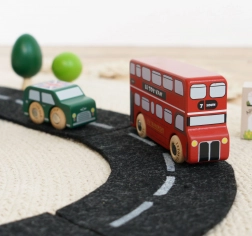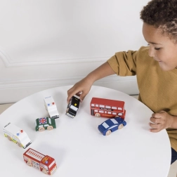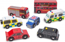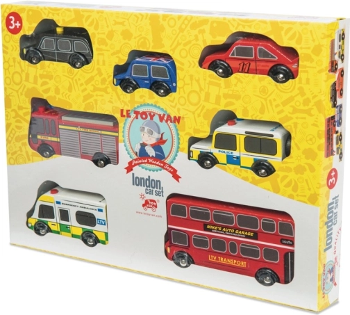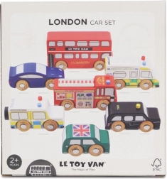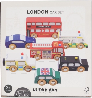 Objevte svět rušných londýnských ulic s detailně zpracovanými dřevěnými vozidly od Le Toy Van. Sada zahrnuje dvoupatrový autobus, černý taxík, hasičské auto, sanitku, policejní vůz a dvě osobní auta. Robustní provedení z udržitelného kaučukového dřeva a hladké hrany jsou ideální pro malé dětské ruce, které si při hře procvičí úchop, koordinaci ruka–oko i fantazii.