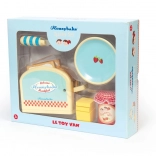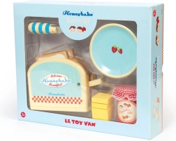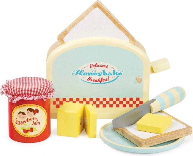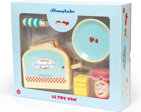 Dřevěná sada Honeybake od LE TOY VAN promění dětský koutek v útulnou kuchyňku. Děti si zamilují realistický topinkovač s pružinou, ze kterého po stisknutí vyskočí dva krajíce „toustů“. Máslo se spojem na suchý zip učí správnému úchopu a práci s nožíkem, zatímco sklenička jahodového džemu a talířek doplní každou hravou snídani.