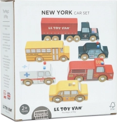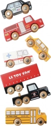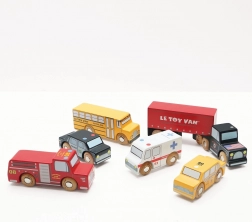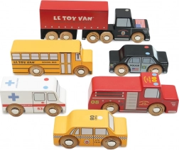 Školní autobus, hasičské auto, sanitka, policejní auto, taxík a kloubový náklaďák tvoří pestrou sadu, která inspiruje k příběhům z rušných ulic města.