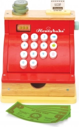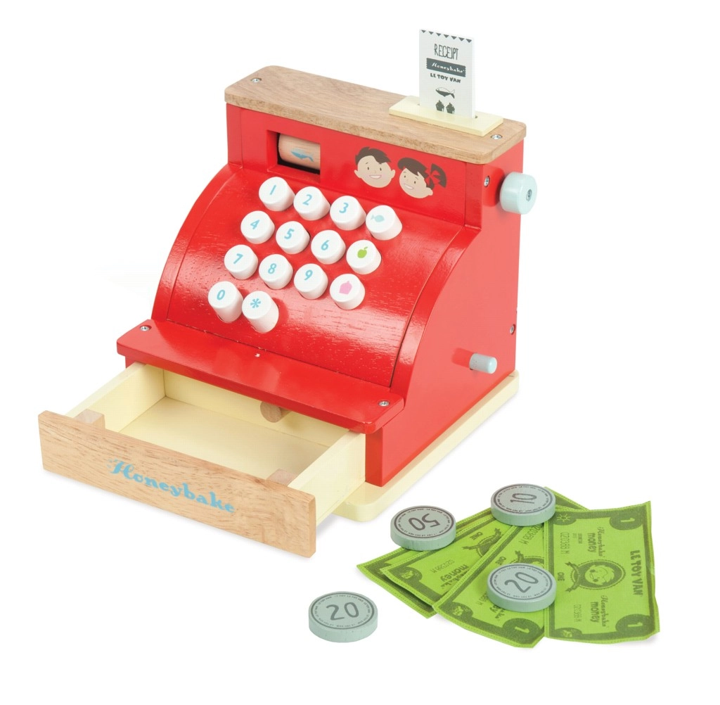 Červená dřevěná pokladna LE TOY VAN z oceňované kolekce Honeybake kombinuje kvalitní zpracování, bezpečné materiály a okouzlující vintage vzhled se zlatými detaily. Je ideální pro hraní na obchod a rozvoj sociálních dovedností, kreativity a základních matematických dovedností.