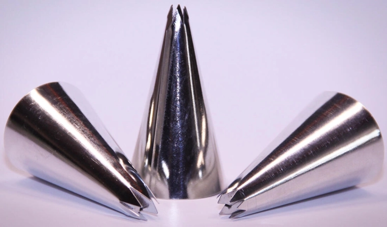 Špičky jsou vyrobeny z pocínovaného plechu, který zajišťuje dobrou odolnost a snadnou údržbu. Jsou připraveny k použití s běžnými bavlněnými cukrářskými sáčky – stačí vložit a můžete zdobit. Vhodné pro máslové krémy, šlehačku, tvarohové i pudinkové náplně.