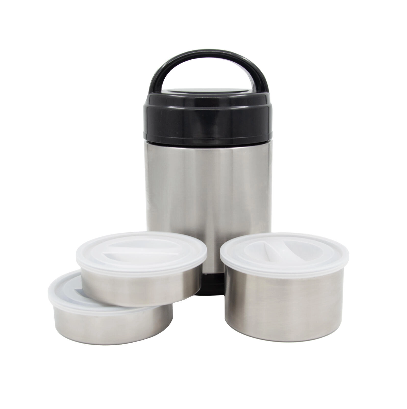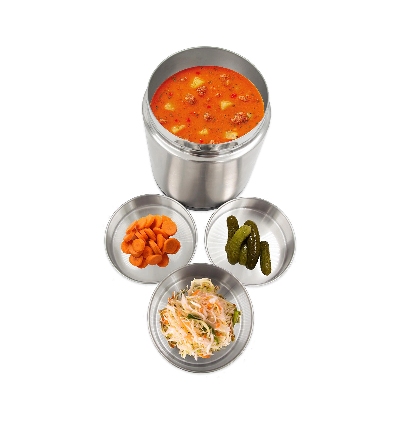 Termoska na jídlo s průměrem 11 cm kombinuje odolnou nerez ocel s praktickými plastovými prvky. Uvnitř najdete tři samostatné misky – dvě o objemu 0,25 l a jednu 0,5 l – každá s plastovým těsnícím víčkem. To umožňuje bezpečně oddělit různé chody, udržet čerstvost a pohodlně servírovat. Vnější plastové dno snižuje hlučnost při pokládání a robustní rukojeť usnadňuje přenášení.